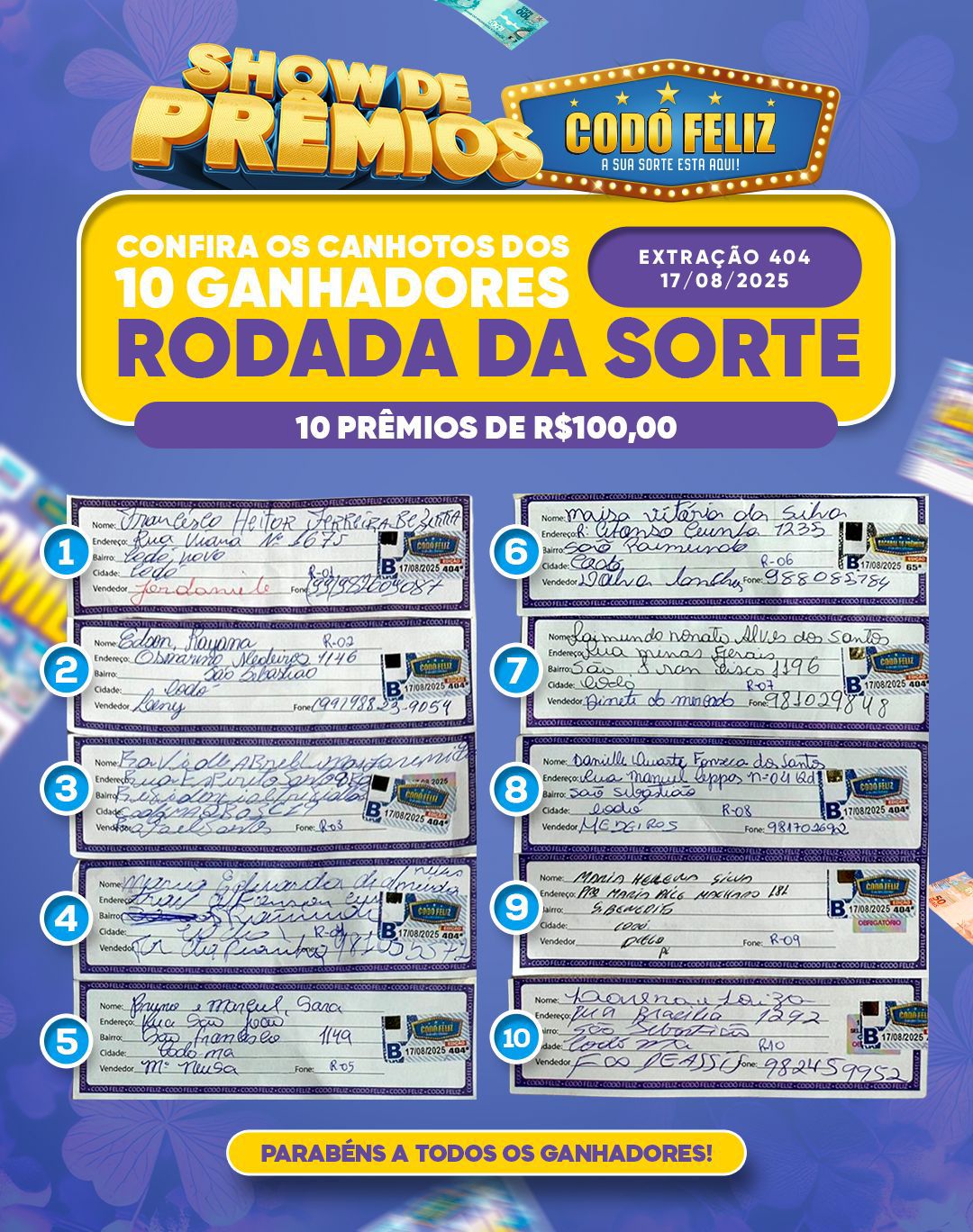 Confira os canhotos dos ganhadores da 404° Extração do Codó Feliz Publicado em: 17 de agosto de 2025Autor: Alberto BarrosDeixe um Comentário!
