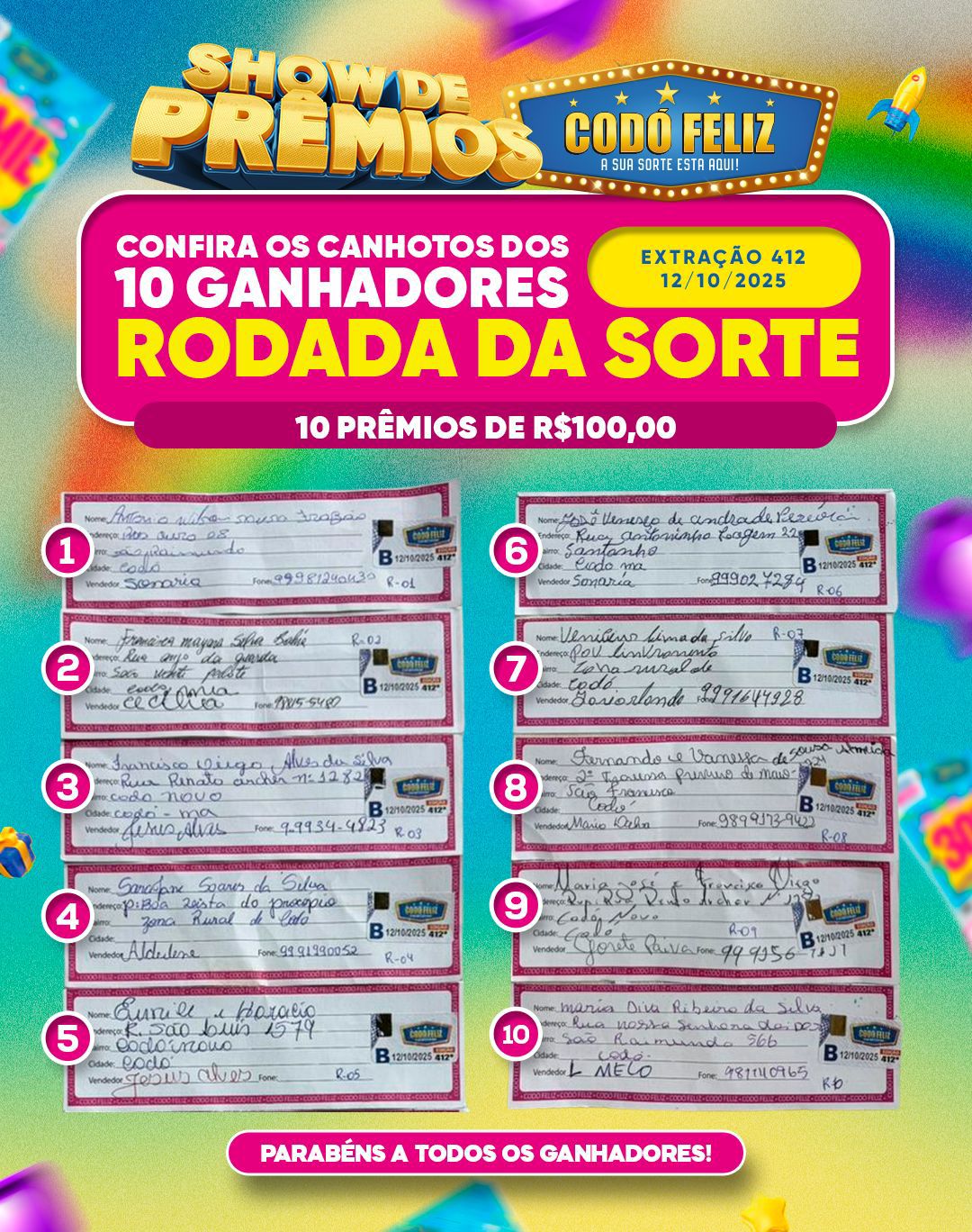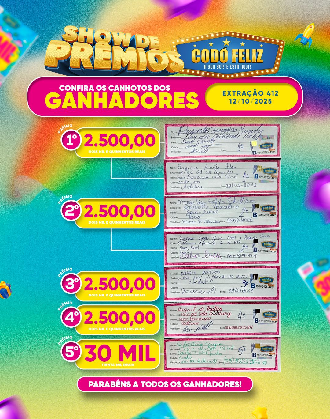 Confira os canhotos dos Ganhadores da 412° Extração do Codó Feliz desse domingo Publicado em: 12 de outubro de 2025Autor: Alberto BarrosDeixe um Comentário!