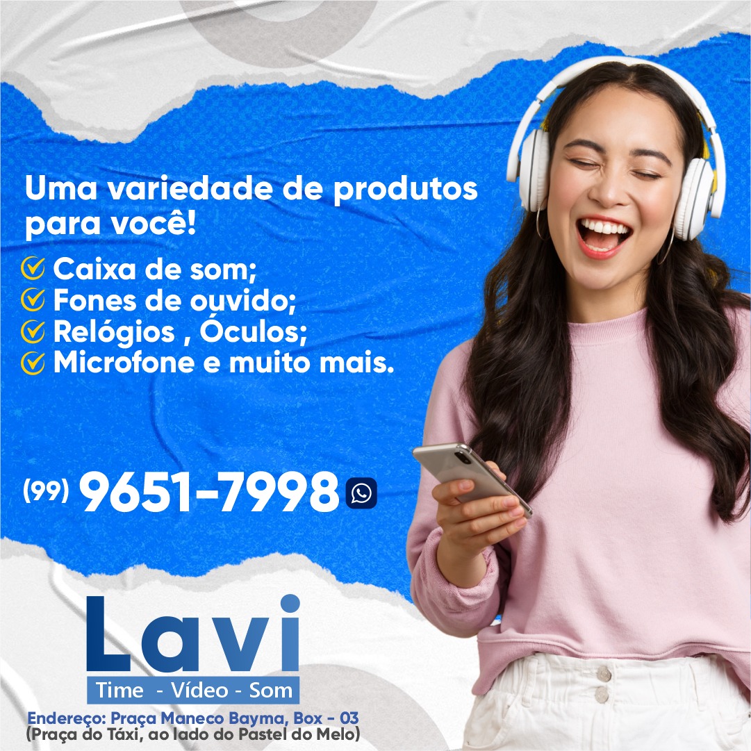 Conheça a Lavi – Time, Vídeo e Som. Uma grande variedade em produtos eletro utilitários, assessórios e equipamentos. Rádios, caixas de som, relógios, óculos, microfones e muito mais. A Lavi – Time, Vídeo e Som fica localizada na Praça Maneco Bayma (Praça do Taxi), Box 03, no centro de Codó.