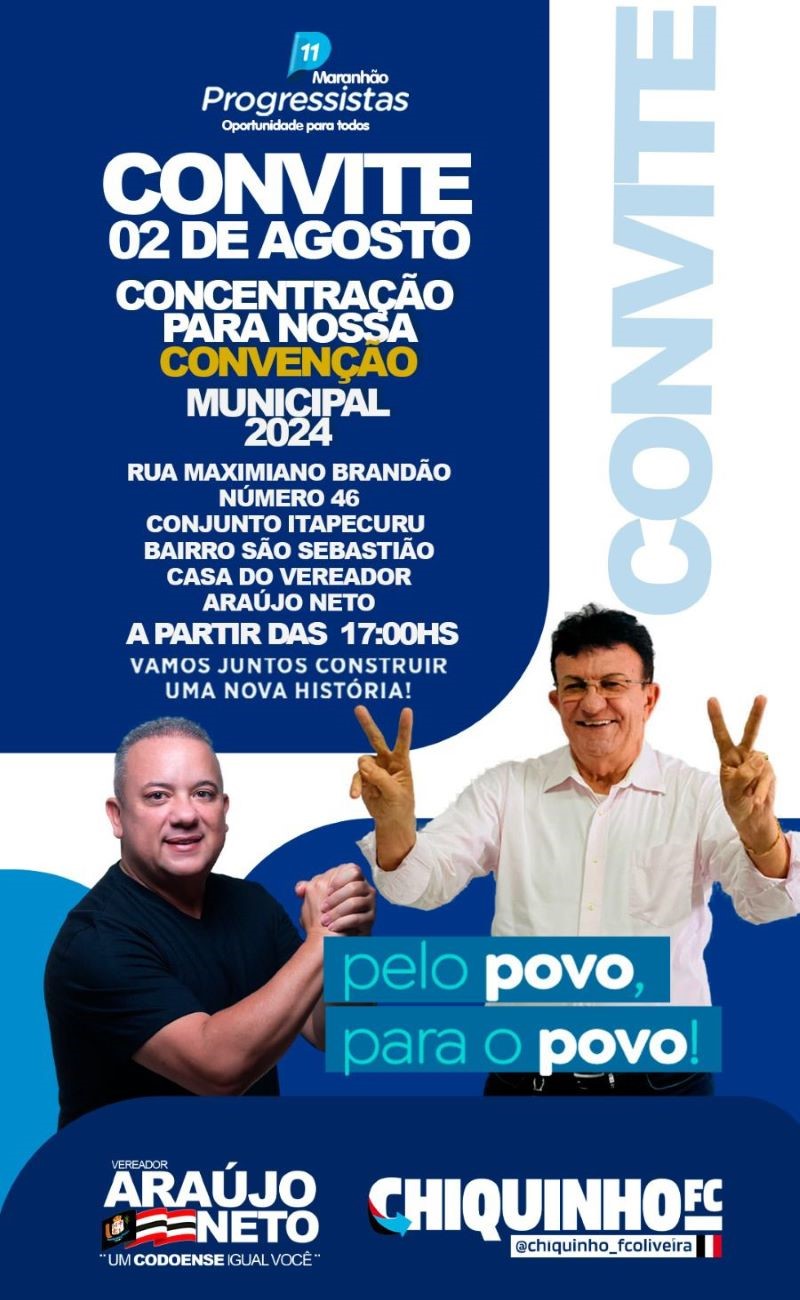 A Executiva Municipal do Progressista de Codó tem a imensa honra de convidá-los para participar da nossa Convenção Municipal, que ocorrerá nesta sexta-feira, dia 02 de agosto. Neste evento, serão apresentados os candidatos e a formação da coligação para as eleições municipais deste ano. Reafirmaremos o total apoio a pré-candidatura a prefeito de Chiquinho FC e apresentaremos a nominata completa do PP para o Legislativo Municipal