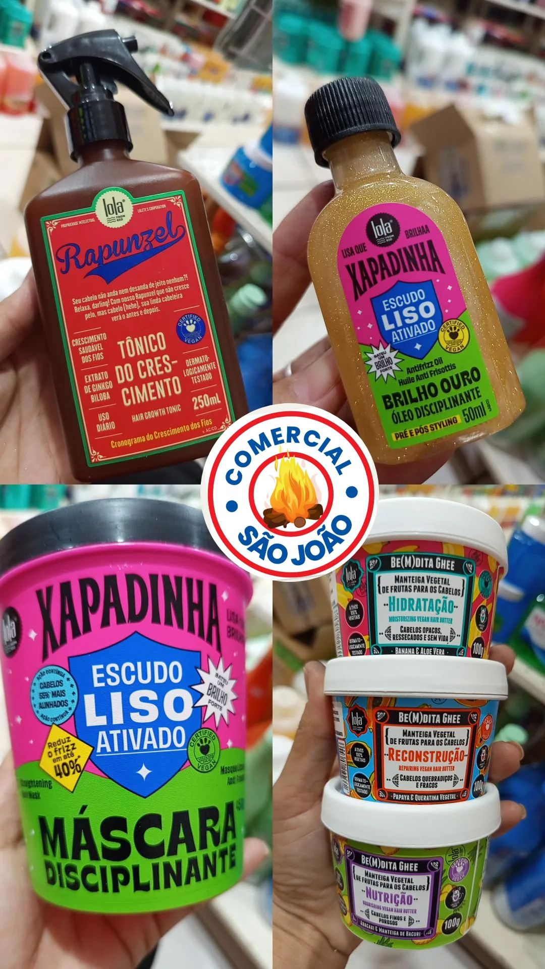 O Comercial São João conta com muitas novidades e ofertas em clima de São João. Se surpreenda com a infinidade de produtos, mesas e cadeiras de plástico, capas para sofá, artigos para o lar, cosméticos das melhores linhas profissionais, variedade em maquiagens, bolsas femininas e mochilas e utensílios domésticos, sempre com os melhores preços do mercado e as melhores condições de pagamento. E comprando Botox de um quilo você leva um shampoo ante resíduo.