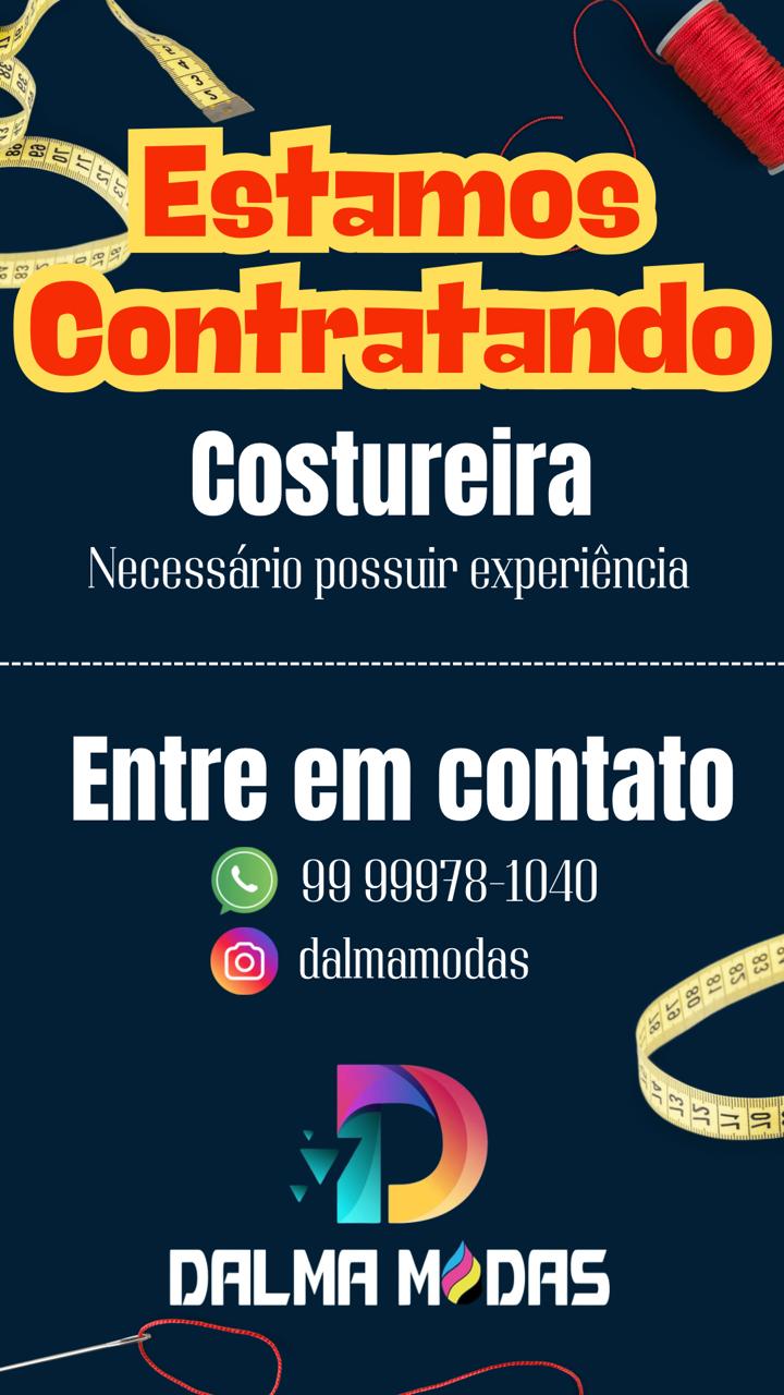 Dalma Modas Está Contratando Costureira; entre em contato pelo WhatsApp (99) 99978-1040 ou pelo Instagram @dalmamodas
