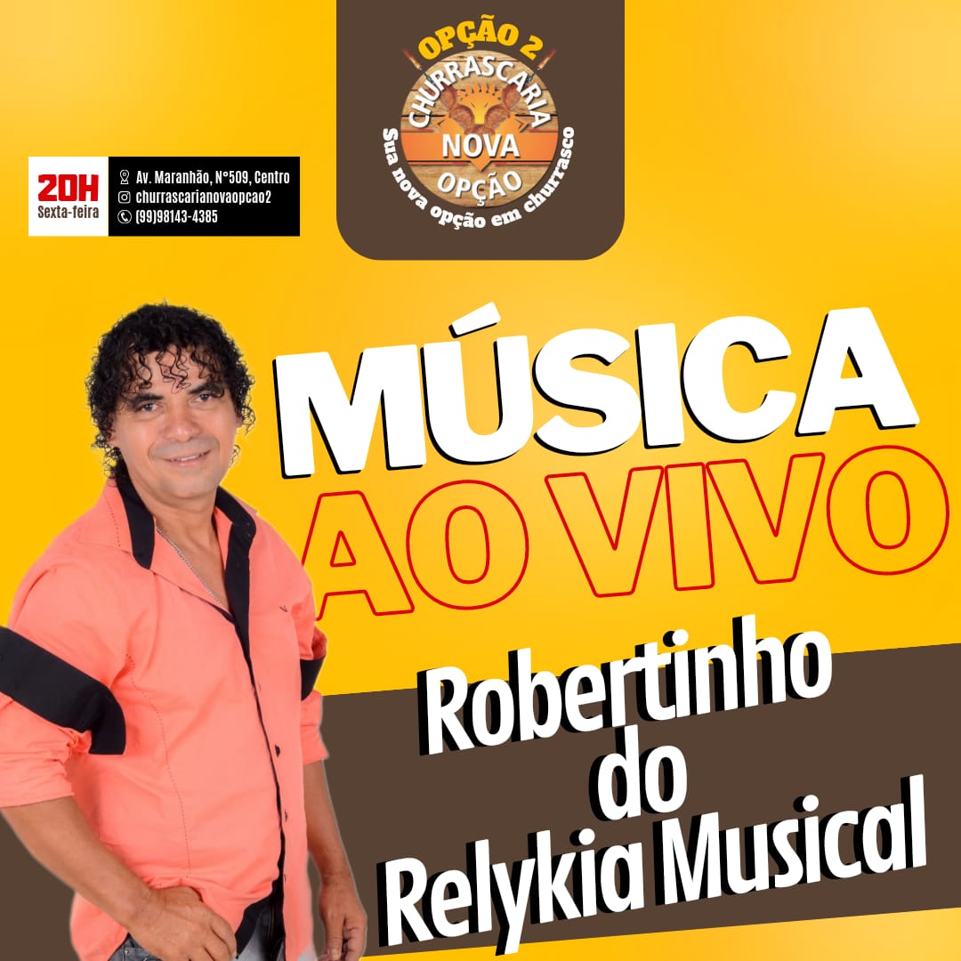Sexta-feira é dia de saborear um churrasco de qualidade na Churracaria Nova Opção 2, e na oportunidade, curtir um som ao vivo com o cantor Robertinho do Relykia Musical, a partir das 20h.