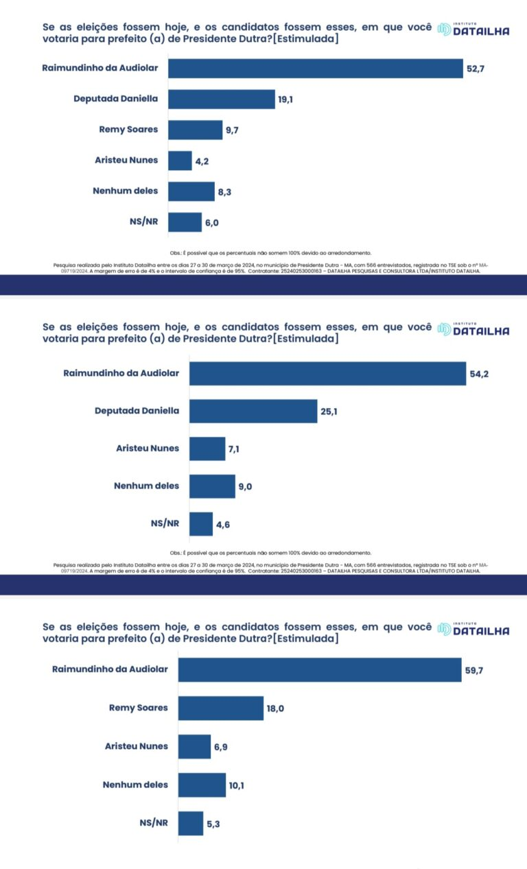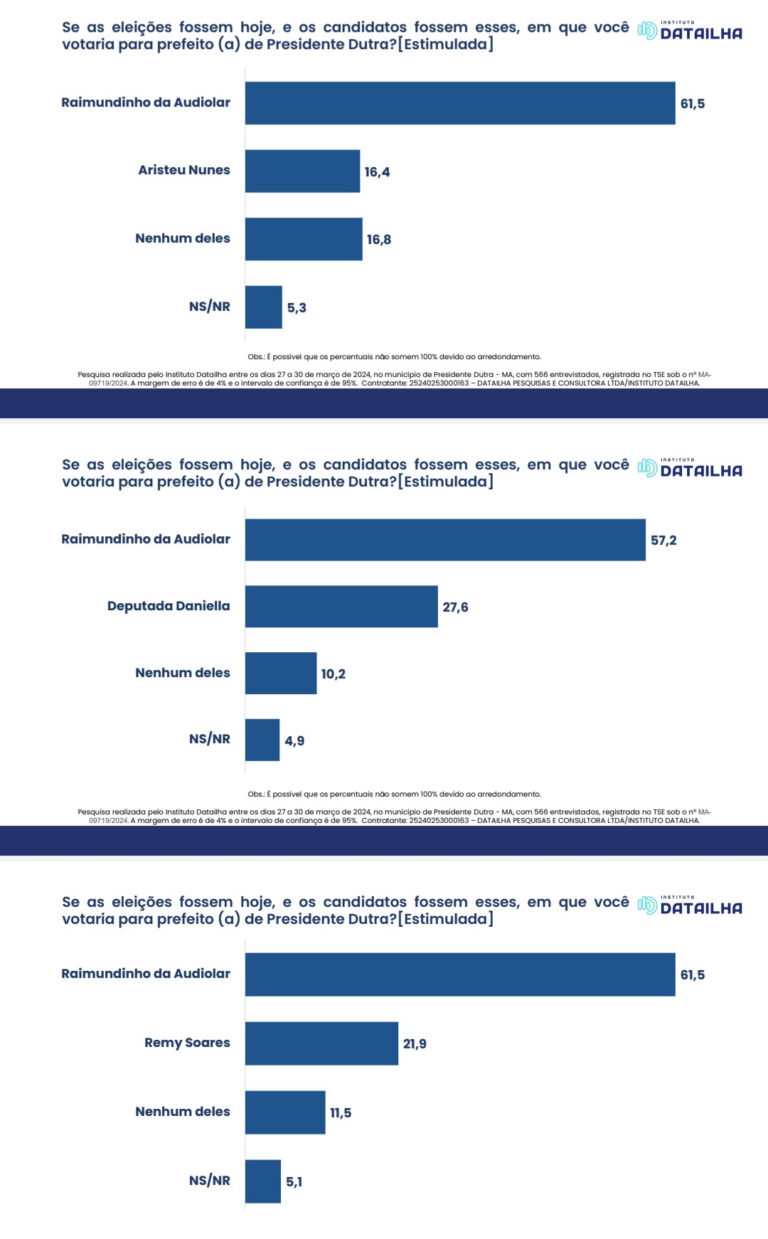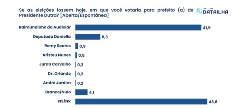 Pesquisa do instituto Data Ilha de intenções de votos para prefeito de Presidente Dutra, divulgada neste domingo, 7, mostra que o atual prefeito, Raimundinho da Audiolar, tem ampla vantagem obre todos os seus concorrentes diretos, em todos os cenários.