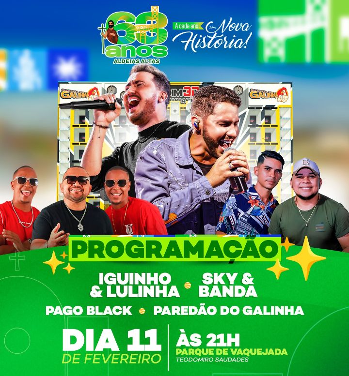 A cidade de Aldeias Altas, localizada na região dos cocais do Maranhão, está em contagem regressiva para comemorar seus 63 anos de emancipação política. A festividade, que ocorrerá no dia 11 de fevereiro, terá como grande destaque o show da renomada dupla de forró, Iguinho e Lulinha, além da atração local, Sky e Banda. Para completar a festa, foram confirmados o Paredão do Galinha e a banda Pago Black, prometendo uma noite histórica, com muito som, energia e aquela vibe que só Aldeias Altas sabe fazer!