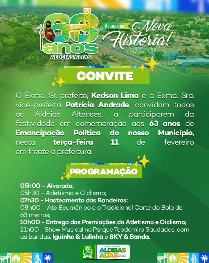 O prefeito Kedson Lima e a vice-prefeita Patrícia Andrade convidam todos os Aldeias Altenses para a festividade em comemoração aos 63 anos de Emancipação Política do Município, nesta terça-feira, 11 de fevereiro, às 21h, no Parque de Vaquejada Teodomiro Saudades. Veja programação abaixo: