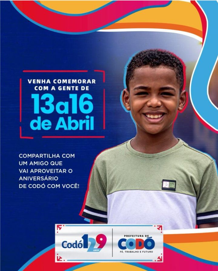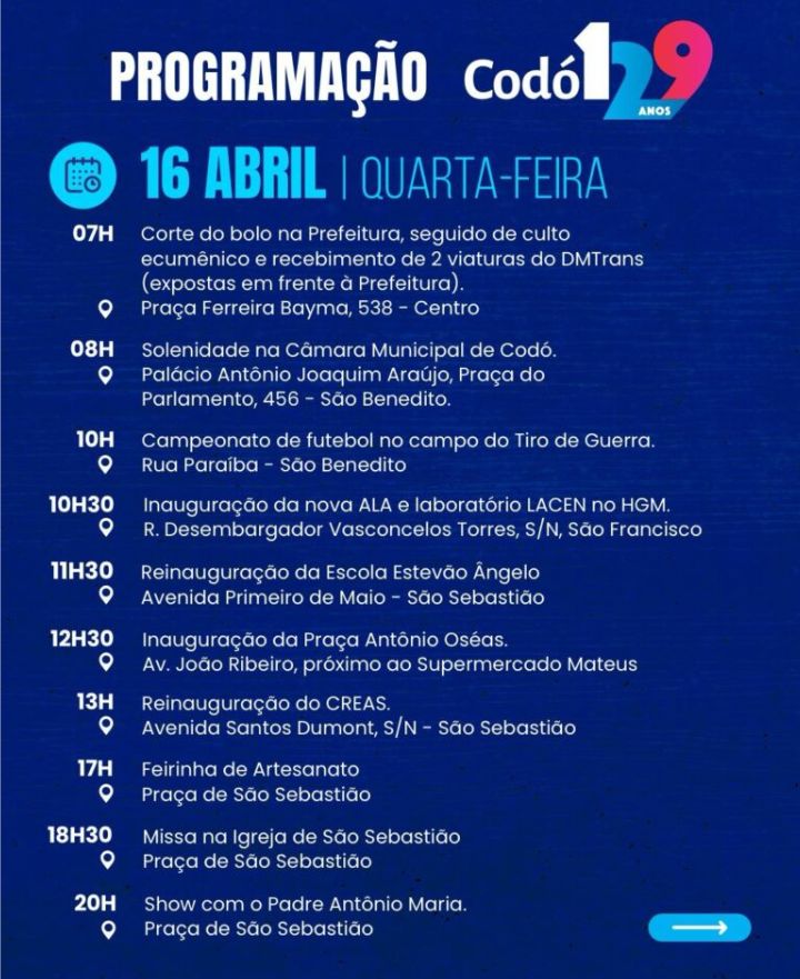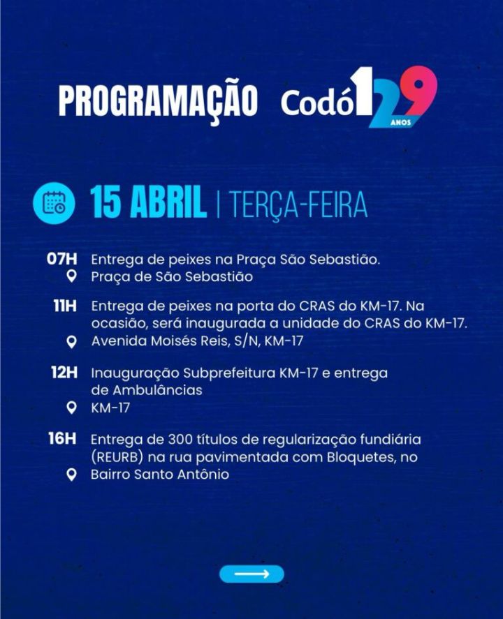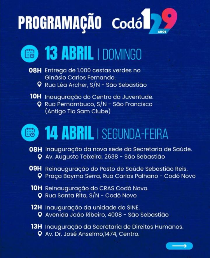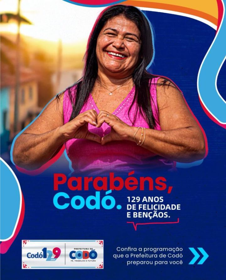 A Prefeitura de Codó divulgou a programação da comemoração de aniversário dos 129 anos de emancipação política. Está previsto inaugurações de várias obras, entrega de cestas verdes e de peixes e obras na zona rural.