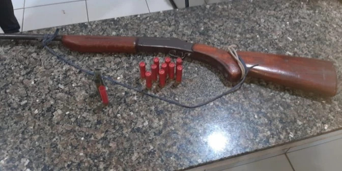Durante a ação policial, foram apreendidos uma espingarda calibre .32 com numeração suprimida, além de 10 munições intactas e três deflagradas, encontradas na residência e no estabelecimento do investigado.