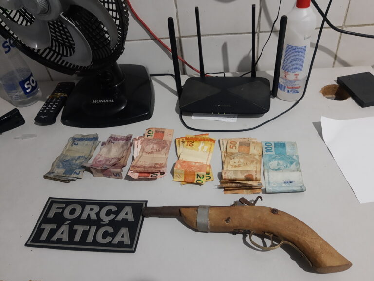 Com os criminosos foram encontrados em sua posse uma arma de fabricação caseira, 727 reais recuperados e devolvidos a vítima e uma moto utilizada