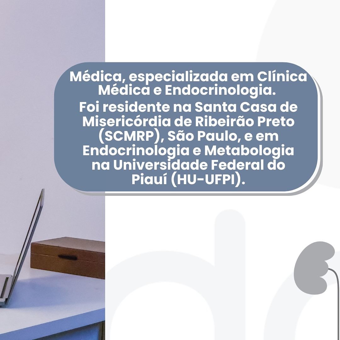 Dra. Rafaela médica, especializada em Clínica Médica e Endocrinologia. Foi residente na Santa Casa de misericórdia de Ribeirão Preto, São Paulo, e em endocrinologia e metabologia na Universidade Federal do Piauí.