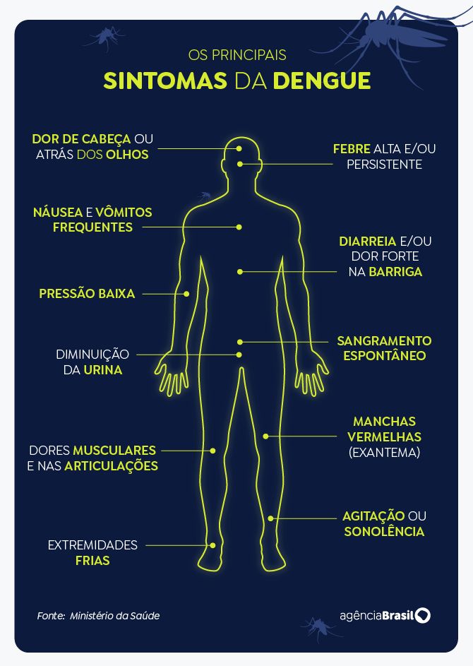 Os principais sintomas da dengue. Foto: Arte/EBC
