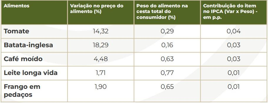 A publicação também destaca a inflação persistente no setor alimentício, que voltou a acelerar em abril. O grupo de Alimentação e Bebidas subiu 0,82% no mês, com destaque para a alta expressiva nos preços da batata (18,29%), tomate (14,32%) e café moído (4,48%) — alimentos que lideraram o impacto no IPCA.