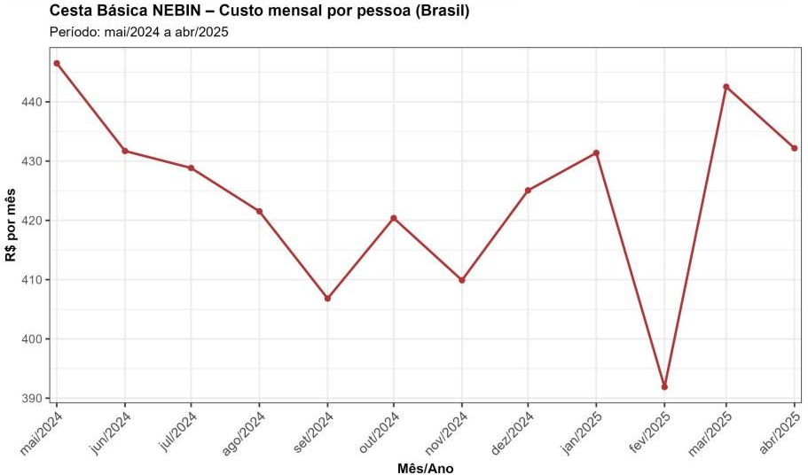 De acordo com o levantamento, esta cesta — elaborada pelo NEBIN (Núcleo de Epidemiologia e Biologia da Nutrição) — teve um custo de R$432 por pessoa em abril de 2025. Isso representa 21,4% da renda média per capita dos brasileiros, estimada em R$2.020, de acordo com dados da PNAD Contínua divulgados no dia 08 deste mês.