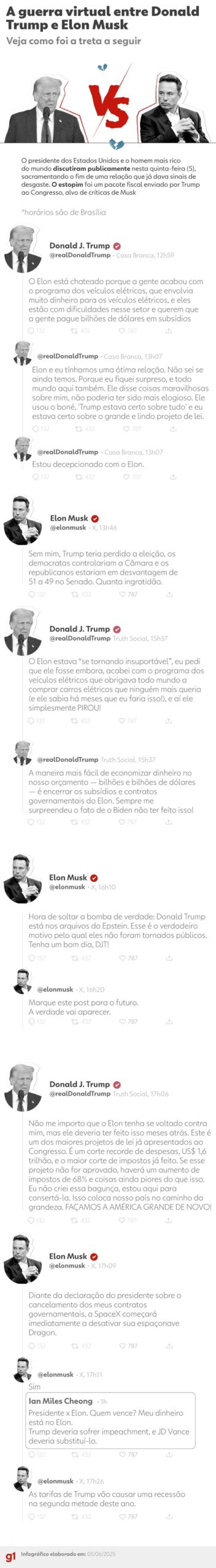 A briga aberta começou quando, em um evento na Casa Branca, o presidente dos EUA disse estar decepcionado com Musk por causa das críticas que o bilionário fez ao projeto de lei orçamentária que foi posteriormente aprovado no Congresso.
