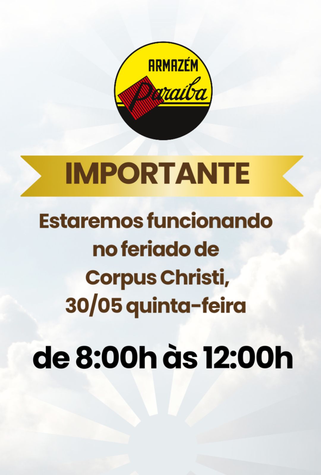 Horário de funcionamento do Paraíba no feriado de Corpus Christi Publicado em: 29 de maio de 2024Autor: Alberto BarrosDeixe um Comentário!