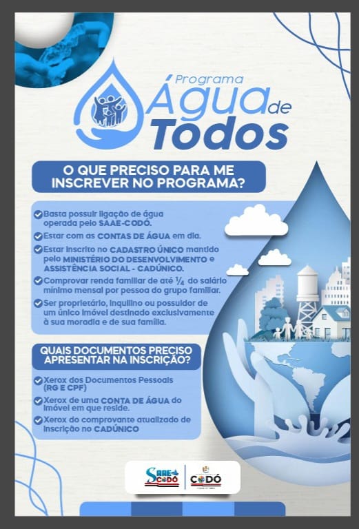 o Programa Água de Todos no município. O programa é mais uma ação da gestão do Governo Cidade de Todos em parceria com o Serviço Autônomo de Água e Esgoto (SAAE). Todos os bairros e comunidades serão beneficiados. Ao todo, o programa irá beneficiar cerca de 3.000 famílias codoenses.