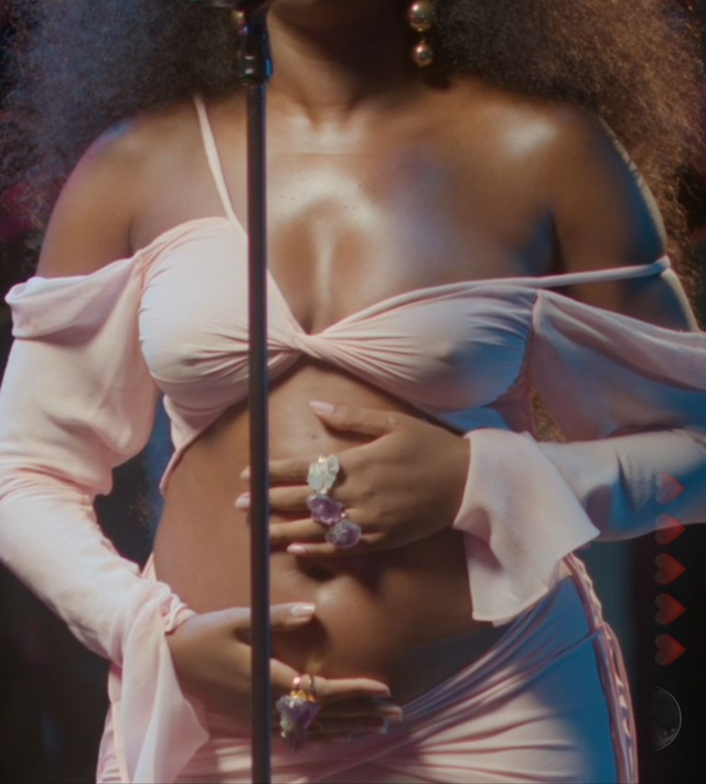 “Quando eu lancei o álbum ‘Afrodith’, eu me coloquei dentro de um saco gestacional. Eu virei um feto e agora eu sou mãe pela primeira vez, tenho um feto dentro de mim”, disse.
