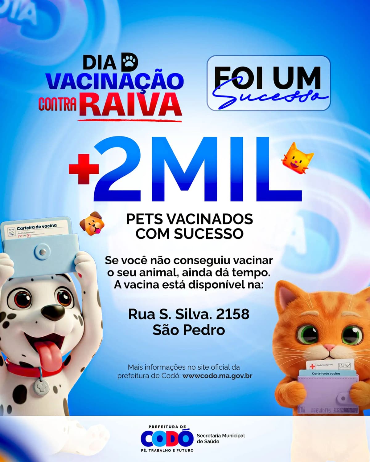A Prefeitura de Codó reforça o convite para que todos os tutores levem seus cães e gatos para vacinar, contribuindo para uma cidade mais segura, saudável e livre da raiva.