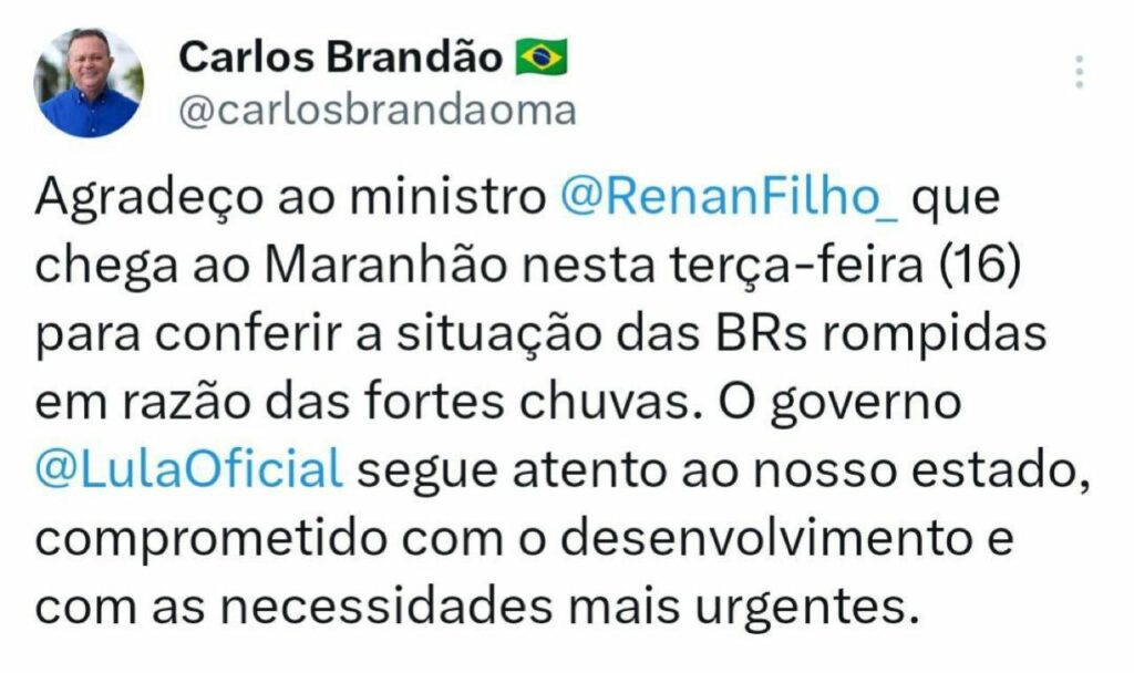 O governador Carlos Brandão (PSB) informou pelo X (antigo Twitter) que o Ministro dos Transportes Renan Filho chega ao Maranhão nesta terça-feira (16) para conferir a situação das BR’s rompidas em razão das fortes chuvas.