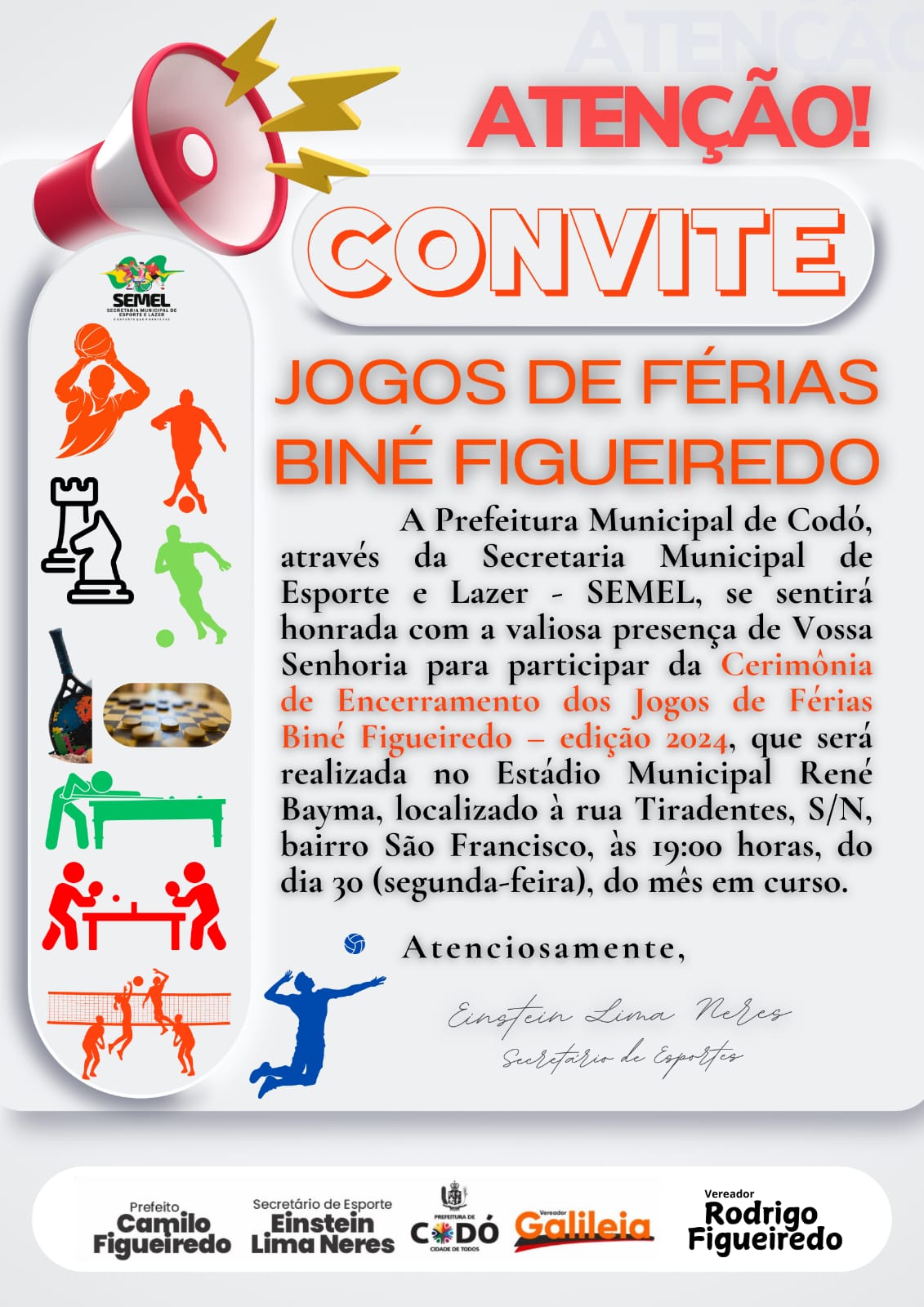 A Prefeitura Municipal de Codó, através da Secretaria Municipal de Esporte e Lazer – SEMEL, se sentirá honrada com a valiosa presença de Vossa Senhoria para participar da Cerimônia de Encerramento dos Jogos de Férias Biné Figueiredo – edição 2024, que será realizada no Estádio Municipal René Bayma, localizado à rua Tiradentes, S/N, bairro São Francisco, às 19:00 horas, do dia 30 (segunda-feira), do mês em curso.