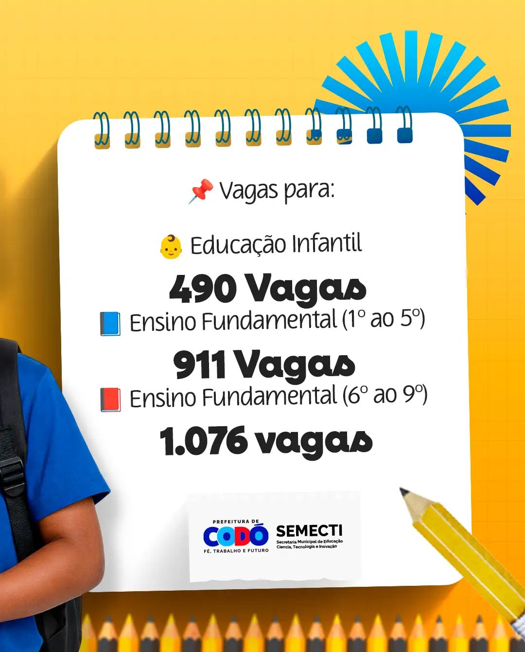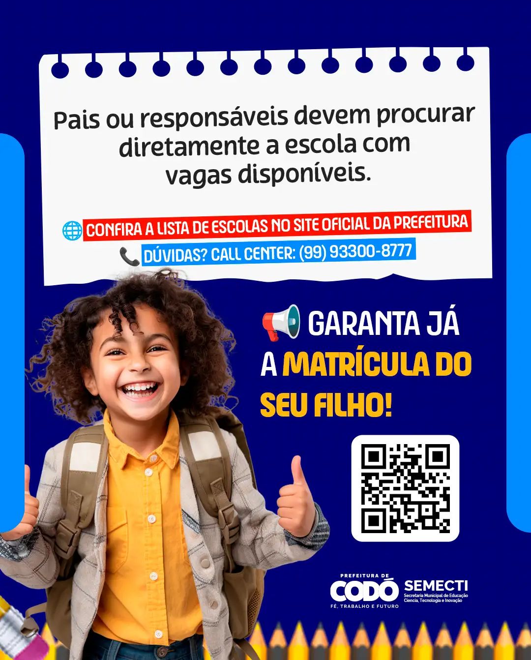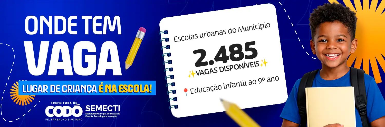 A Prefeitura de Codó, por meio da Secretaria Municipal de Educação, Ciência, Tecnologia e Inovação (SEMECTI), informa que a rede pública municipal de ensino ainda dispõe de 2.485 vagas abertas em escolas localizadas exclusivamente na zona urbana do município. As oportunidades são destinadas a crianças e adolescentes que ainda não realizaram matrícula para o atual período letivo.