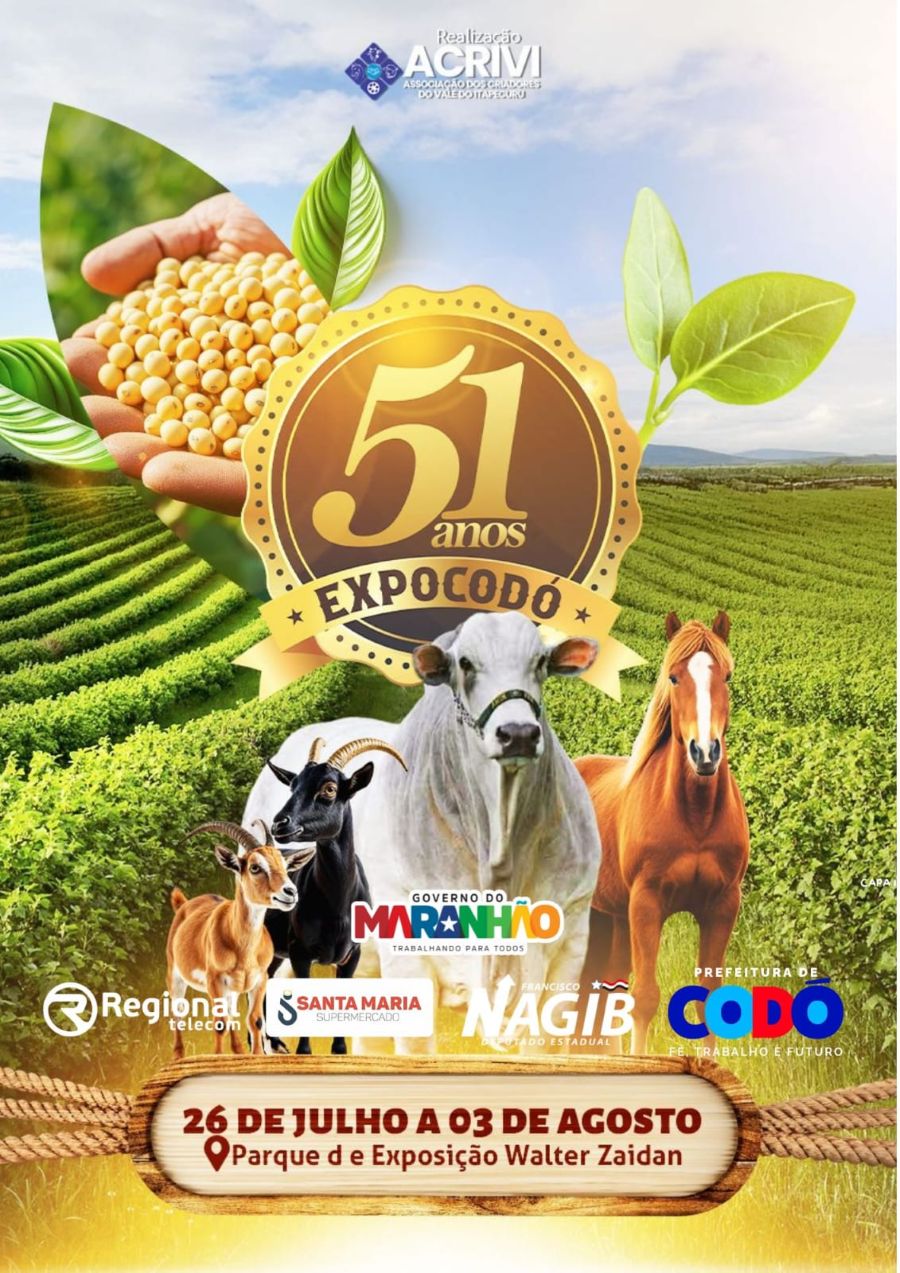 É com alegria que já estamos nos preparando para a 51ª EXPOCODÓ, que acontecerá de 26 de julho a 3 de agosto de 2025, no Parque Walter Zaidan, em Codó, Maranhão. Este evento tem como missão, promover o desenvolvimento da agropecuária na região, valorizando o trabalho dos produtores rurais, promovendo a integração entre o campo e a cidade e incentivando a sustentabilidade e o progresso do estado e região. Convidamos a estar conosco mais uma vez, aproveitando este espaço para mostrar seus produtos, inovações e serviços a um público diverso e engajado. A EXPOCODÓ é, sem dúvida, um ponto de encontro onde a tradição se mescla à modernidade, e a sua presença é indispensável para continuarmos a fazer história. Contamos com a sua presença para fazer desta edição dos 51 anos, um marco ainda mais memorável.
