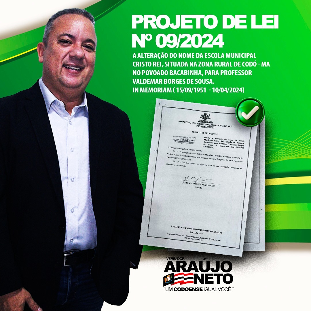O Projeto de Lei Nº 09, de 11 de abril de 2024, Institui a alteração do nome da Escola Municipal Cristo Rei, situada no Povoado Bacabinha, para Professor Valdemar Borges de Souza in memoriam (★ 15/09/1951 + 10/04/2024). O projeto já havia recebido pareceres favoráveis da Comissão de Constituição, Legislação, Justiça, Redação e Administração Pública e Comissão de Educação, Cultura, Esporte, Meio Ambiente, Agricultura e Abastecimento e foi aprovado pelos vereadores em plenário.