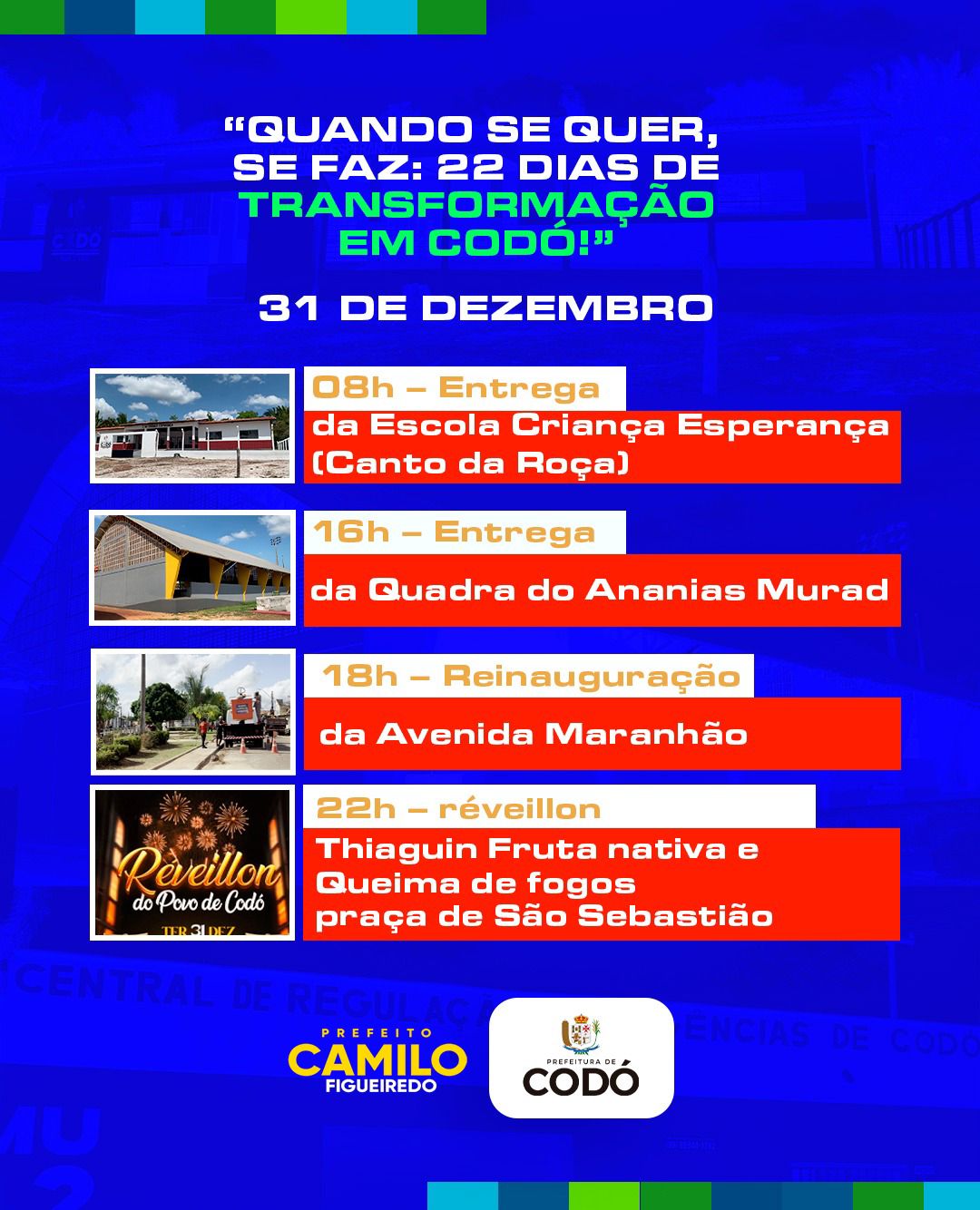 Essas ações refletem o compromisso da Prefeitura de Codó e o prefeito Camilo Figueiredo com a população. Em apenas 22 dias, foi possível realizar mudanças significativas, mostrando que, quando se quer, se faz. O trabalho continua, e o futuro de Codó promete ainda mais progresso e realizações.