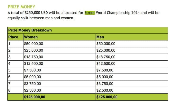 Ao todo, o Mundial de Skate Street distribuiu US$ 250 mil (R$ 1,39 milhões) aos oito participantes da final, divididos igualmente entre a modalidade masculina e feminina.