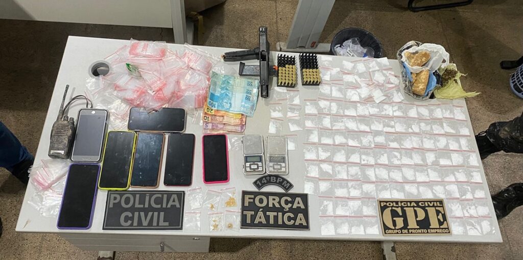 No local, os policiais localizaram e apreenderam, sob a posse dos indivíduos, quantidade de drogas prontas para comercialização, arma de uso restrito, munições, dinheiro, rádio, celulares, apetrechos utilizados na embalagem de entorpecentes e quatro motocicletas que estariam sendo utilizadas para o tráfico de drogas e, também, para o cometimento dos homicídios.