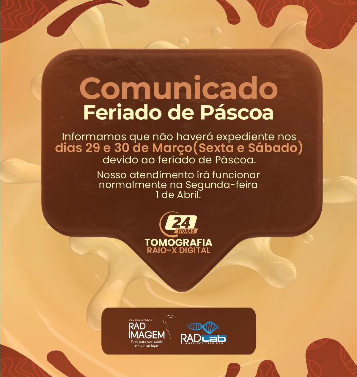 Rad Imagem: comunicado feriado de Páscoa Publicado em: 29 de março de 2024Autor: Alberto BarrosDeixe um Comentário! Atenção ao nosso horário de funcionamento nessa Páscoa. Setor de radiologia continua em funcionamento 24h. Centro Médico Rad Imagem, tudo para sua saúde em um só lugar.