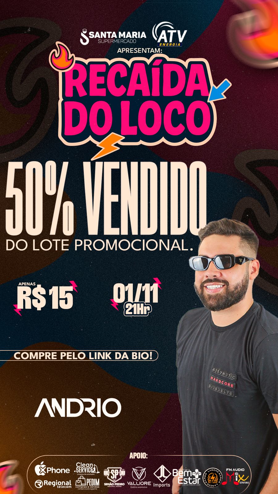 A festa mais esperada do momento está chegando à Locomotiva! No dia 1º de novembro, às 21h, o público vai curtir a energia contagiante de Andrío no evento “Recaída do Loco”, apresentado pelo Supermercado Santa Maria e ATV Energia.