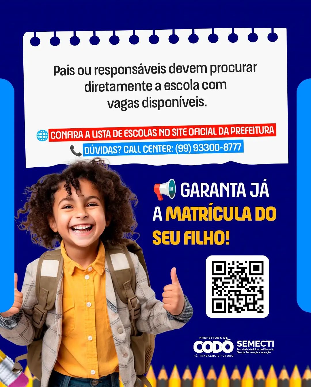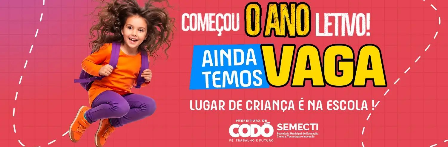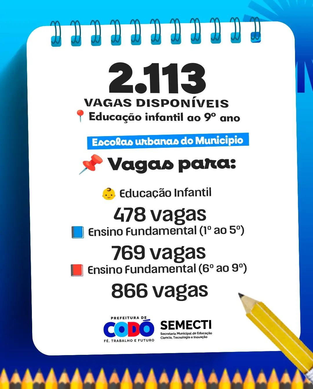 A Prefeitura de Codó, por meio da Secretaria Municipal de Educação, Ciência, Tecnologia e Inovação (SEMECTI), informa que a Rede Municipal de Ensino iniciou oficialmente o ano letivo de 2026 e ainda disponibiliza 2.113 vagas remanescentes em escolas localizadas exclusivamente na zona urbana do município.