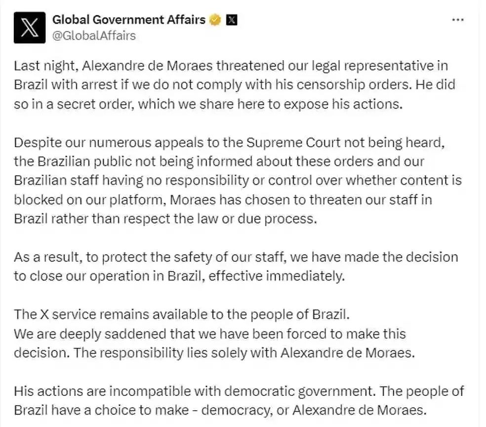 “Apesar de nossos inúmeros recursos ao Supremo Tribunal Federal não terem sido ouvidos, de o público brasileiro não ter sido informado sobre essas ordens e de nossa equipe brasileira não ter responsabilidade ou controle sobre o bloqueio de conteúdo em nossa plataforma, Moraes optou por ameaçar nossa equipe no Brasil em vez de respeitar a lei ou o devido processo legal”, diz o X.