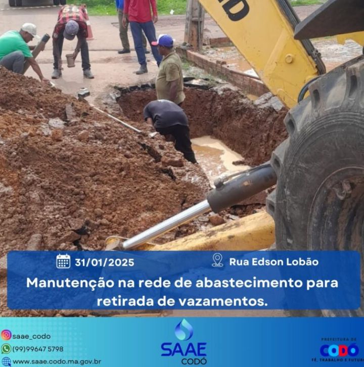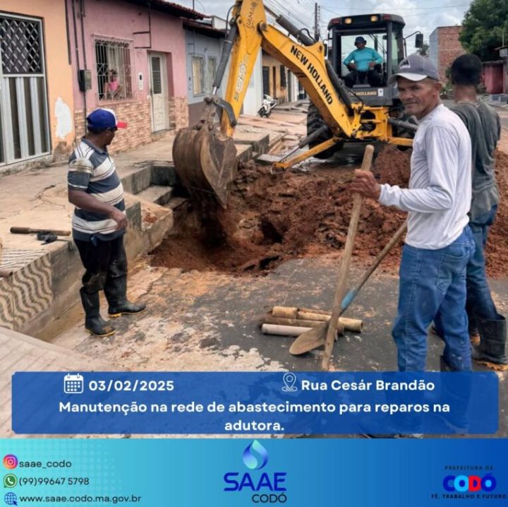 O Serviço Autônomo de Água e Esgoto (SAAE) de Codó segue trabalhando para garantir o abastecimento regular de água para a população codoense. Nos últimos dias, a equipe técnica intensificou as ações de manutenção e reparo na rede de abastecimento em diversas localidades do município.