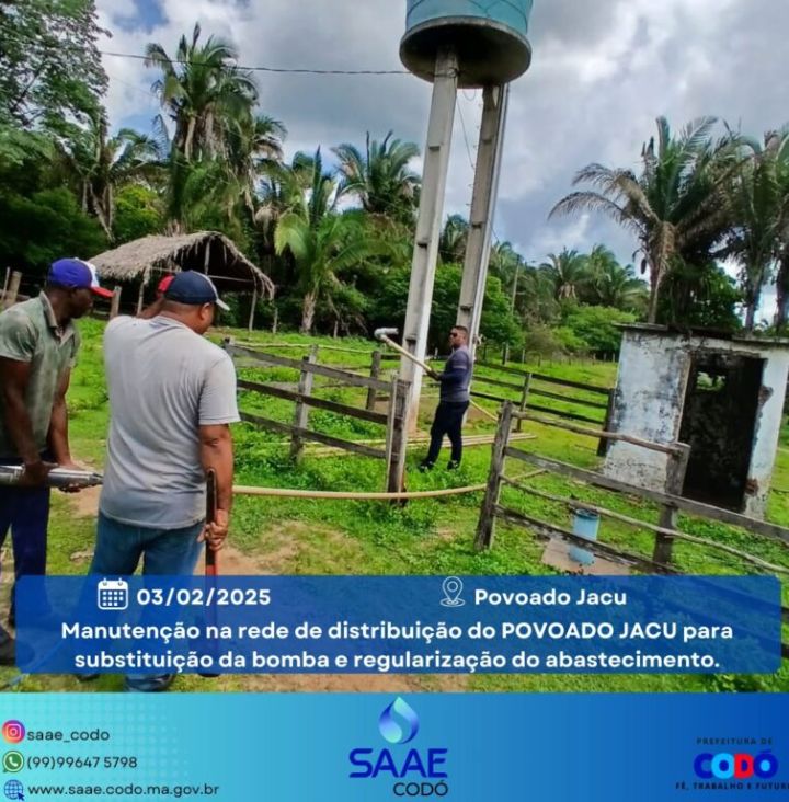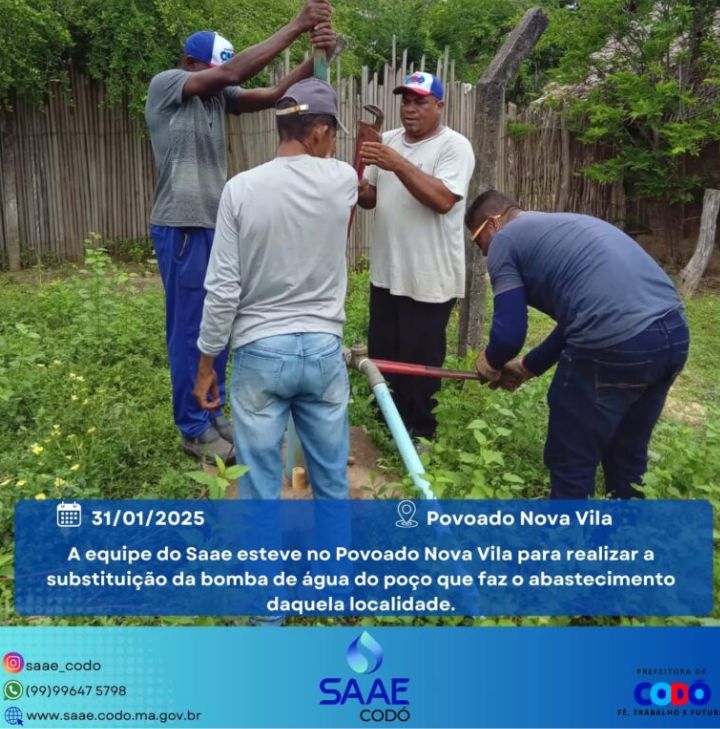 Entre as ações realizadas, destaca-se a manutenção na rede de abastecimento do povoado Jacu, onde foram executados serviços para melhorar a distribuição de água e corrigir falhas no sistema. Além disso, no povoado Nova Vila, a equipe do SAAE efetuou a substituição da bomba de água do poço responsável pelo abastecimento da localidade garantindo mais eficiência e regularidade no fornecimento de água para os moradores.