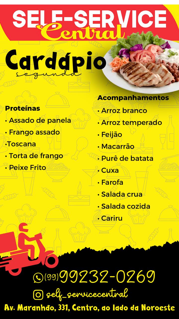 Procurando uma refeição deliciosa e caseira em Codó-MA? No Self Service Central, você encontra um cardápio variado e saboroso de segunda a sábado. Venha conferir nosso menu do dia e desfrutar de uma refeição fresquinha e bem preparada. Estamos na Praça da Bíblia, ao lado da Noroeste. Esperamos por você!
