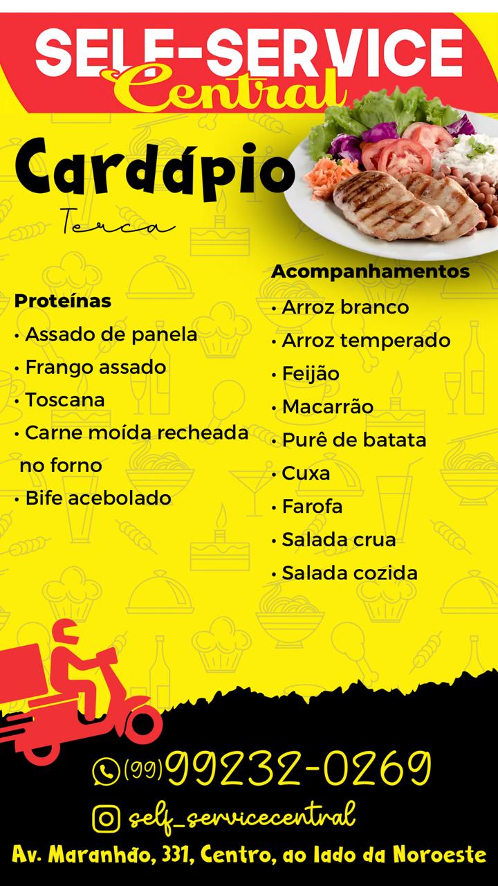 Procurando uma refeição deliciosa e caseira em Codó-MA? No Self Service Central, você encontra um cardápio variado e saboroso de segunda a sábado. Venha conferir nosso menu do dia e desfrutar de uma refeição fresquinha e bem preparada. Estamos na Praça da Bíblia, ao lado da Noroeste. Esperamos por você!