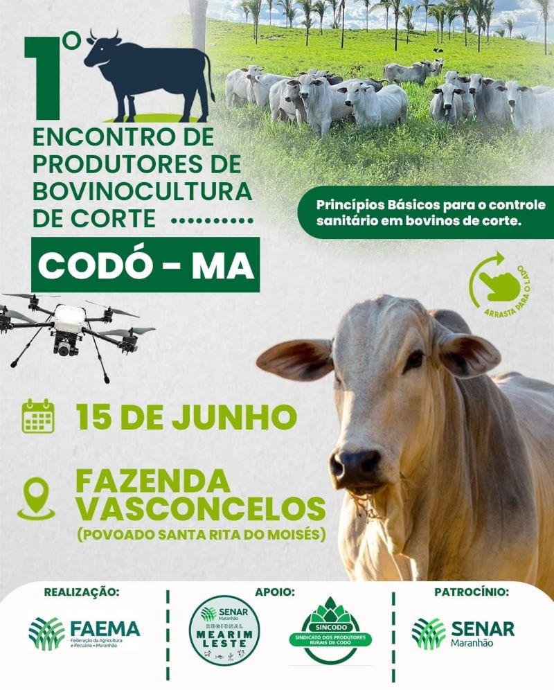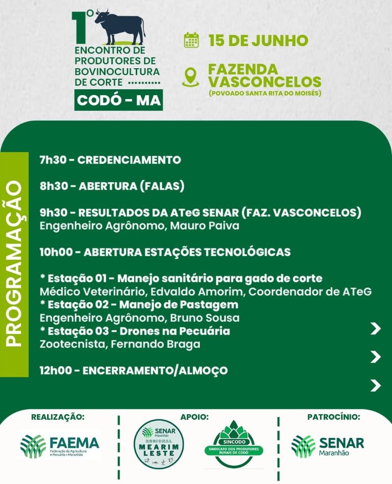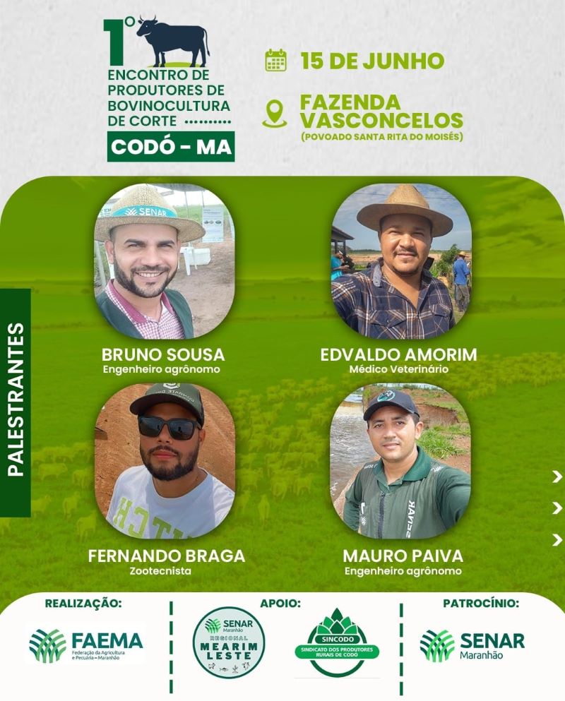 O Sistema FAEMA/SENAR e o Sindicato dos Produtores Rurais de Codó (SINCODÓ) irão realizar o 1° Encontro de Produtores de Bovinocultura de Corte em Codó. O evento será no dia 15 de junho, na Fazenda Vasconcelos, no povoado Santa Rita do Moisés. Confira agora os palestrantes e a programação.