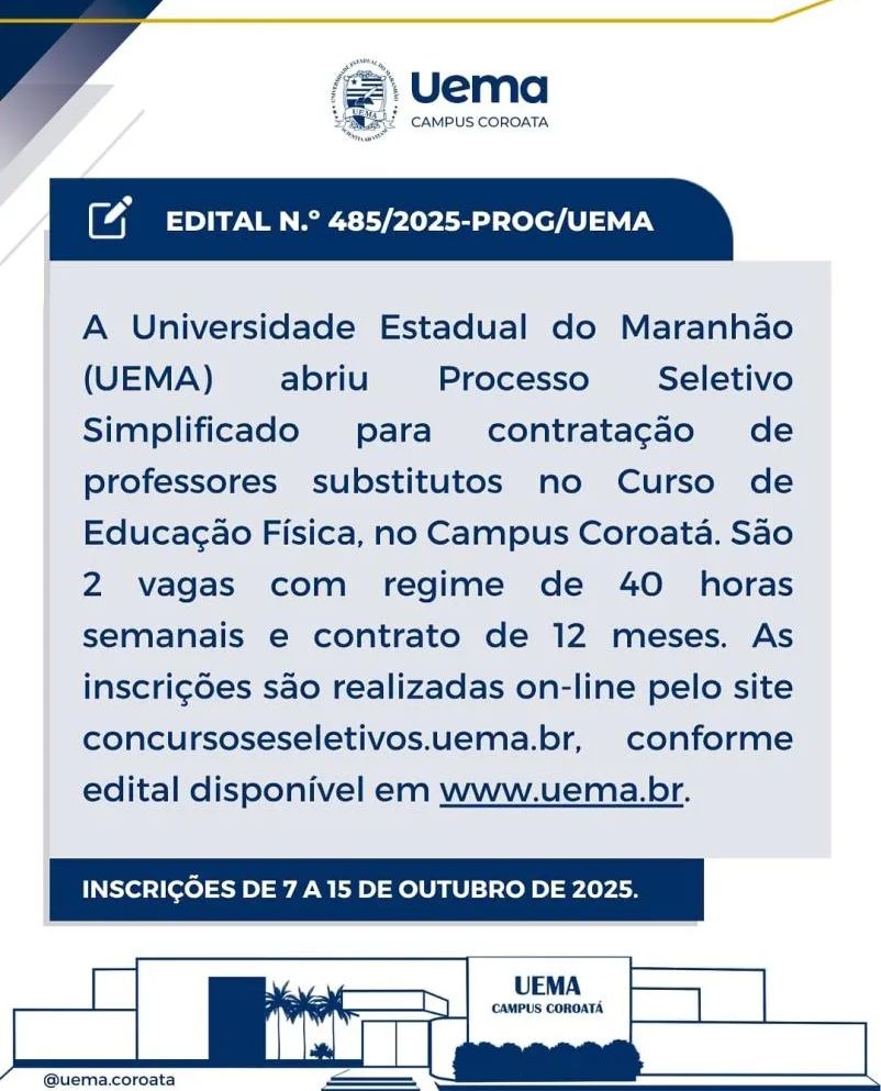 A Universidade Estadual do Maranhão (UEMA), por meio do Campus Coroatá, divulgou a abertura de processos seletivos simplificados para contratação de professores substitutos nos cursos de Psicologia Bacharelado e Educação Física.