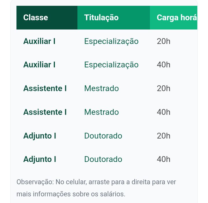 Os valores da remuneração dos professores substitutos variam de acordo com a titulação e a carga horária semanal, conforme a tabela do Grupo Ocupacional Magistério Superior (MAS).