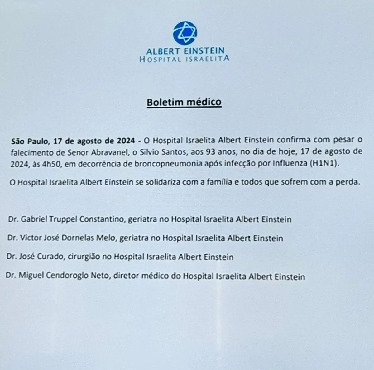 O Hospital Israelita Albert Einstein confirmou que Silvio Santos morreu de broncopneumonia após complicações de H1N1. Internado há 17 dias, o apresentador havia sido hospitalizado em 1º de agosto para realizar exames. Em julho, ele também esteve internado devido ao H1N1, mas havia recebido alta. A broncopneumonia é uma inflamação que afeta os brônquios e alvéolos do pulmão, podendo ser causada por vírus, fungos ou bactérias.