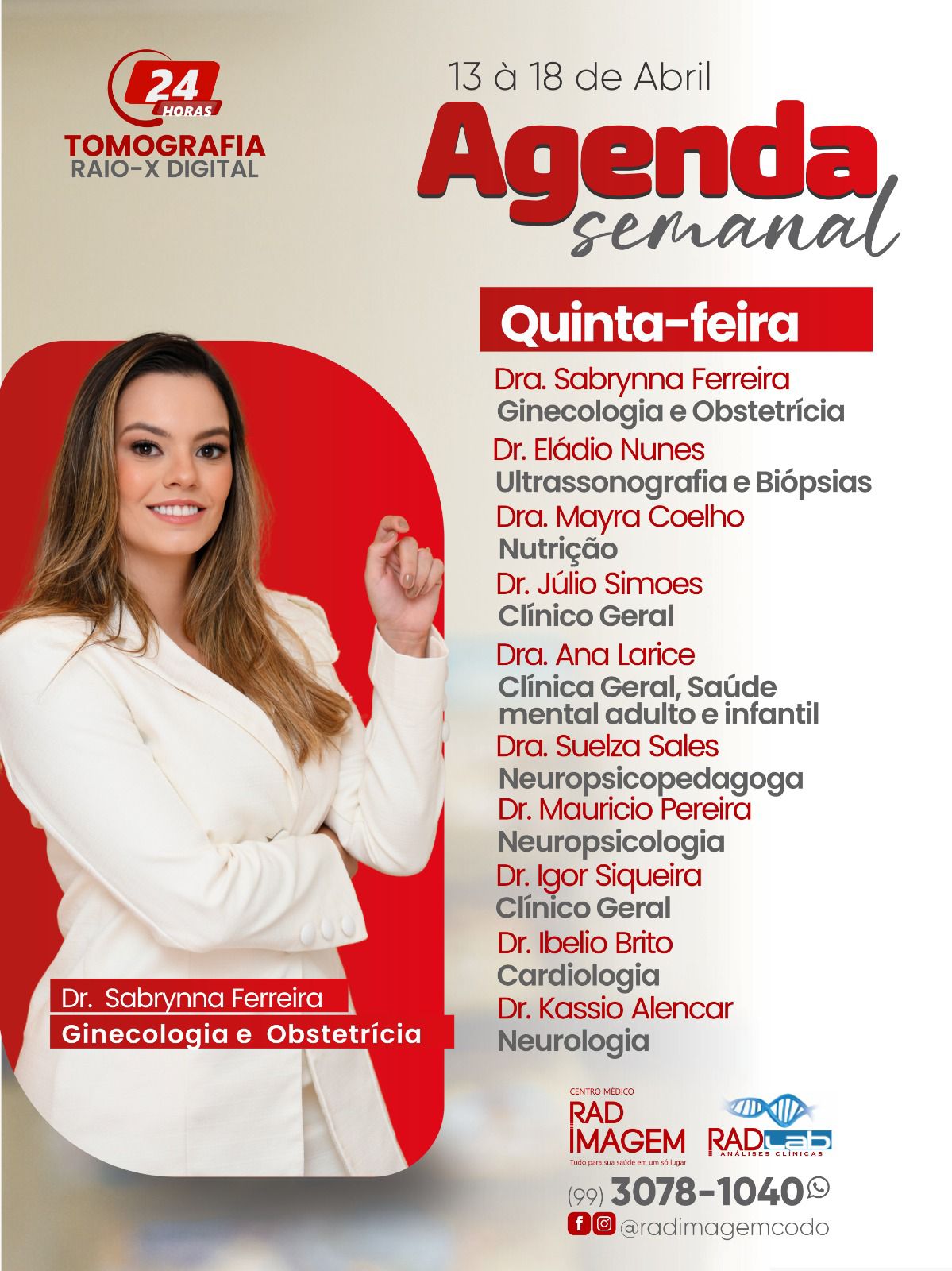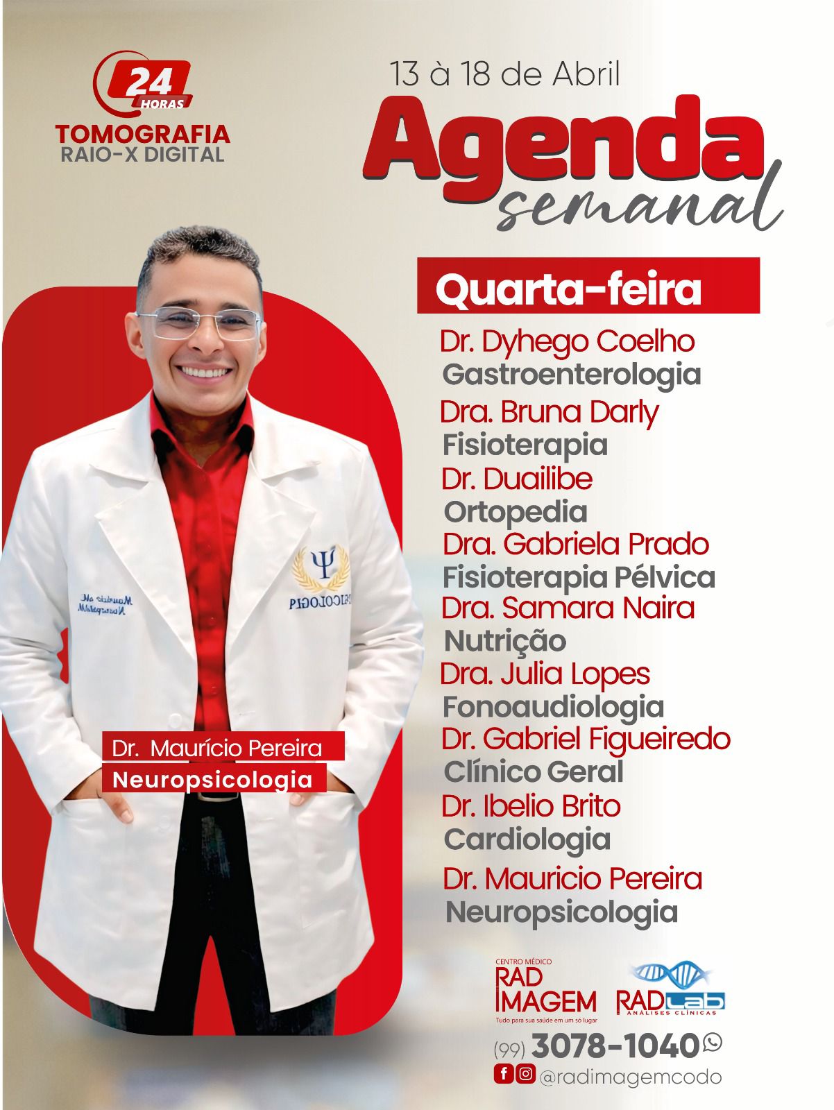 Veja a lista de médicos especialistas desta semana da Rad Imagem Codó Publicado em: 13 de abril de 2026Autor: Alberto BarrosDeixe um Comentário! Veja a lista de especialistas da Rad Imagem e marque sua consulta para esta semana (de 13 à 18 de abril).
