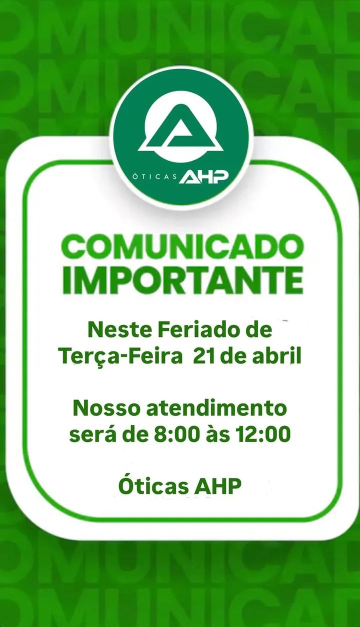 Veja o horário de funcionamento das Óticas AHP neste feriado Publicado em: 21 de abril de 2026Autor: Alberto BarrosDeixe um Comentário!