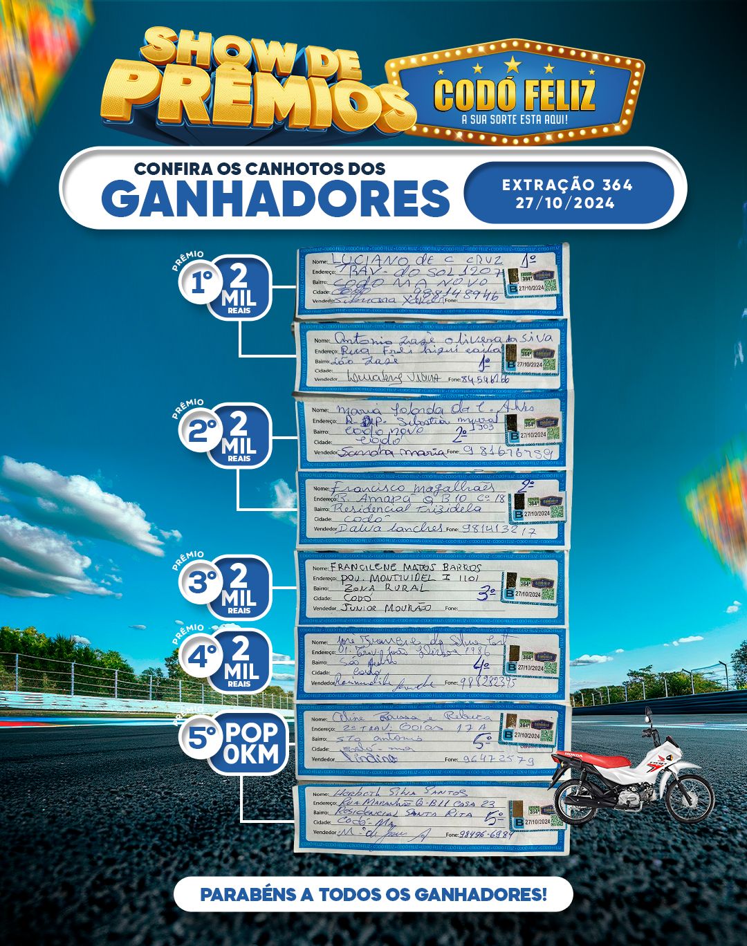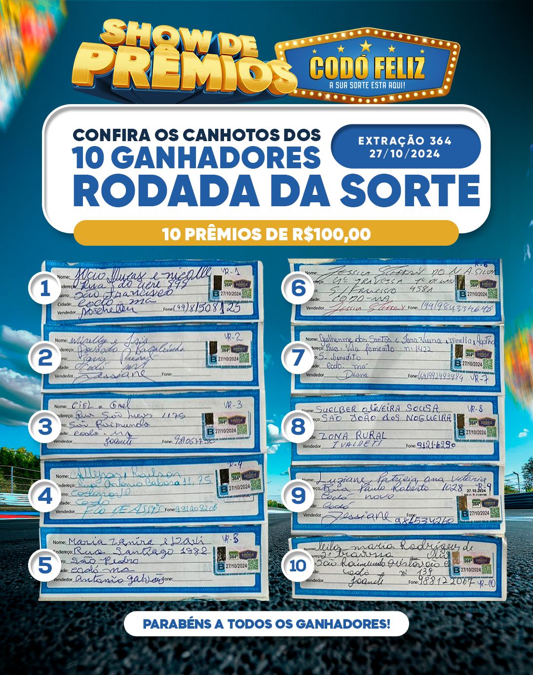 Veja quem foram os Ganhadores da 364ª Extração do Codó Feliz Publicado em: 27 de outubro de 2024Autor: Alberto BarrosDeixe um Comentário!