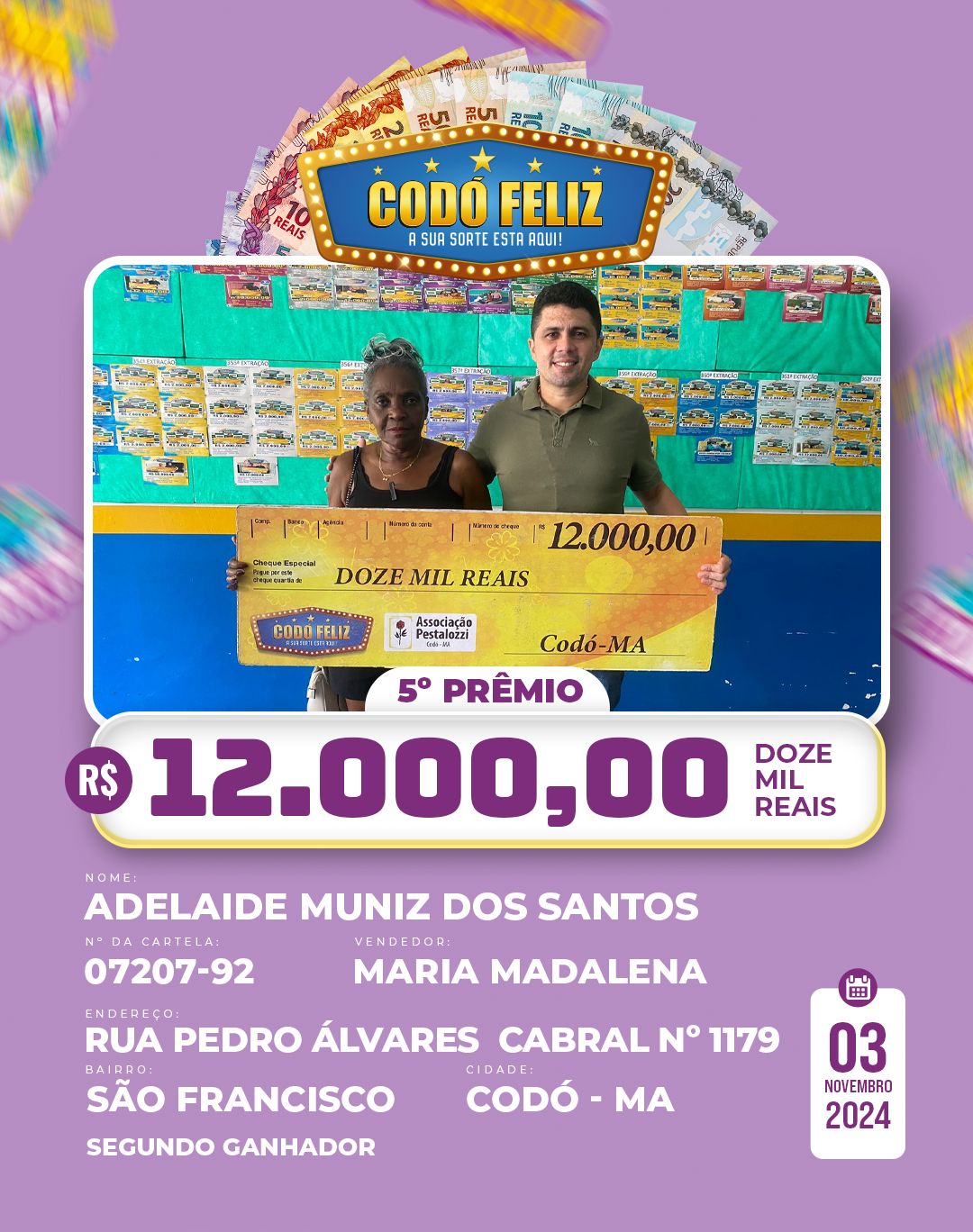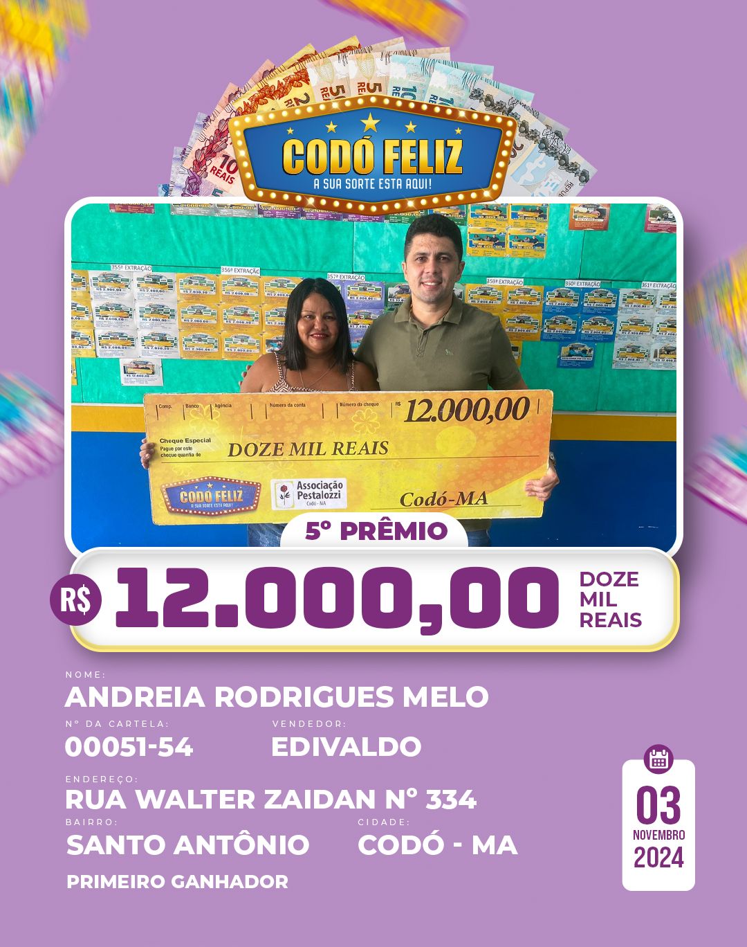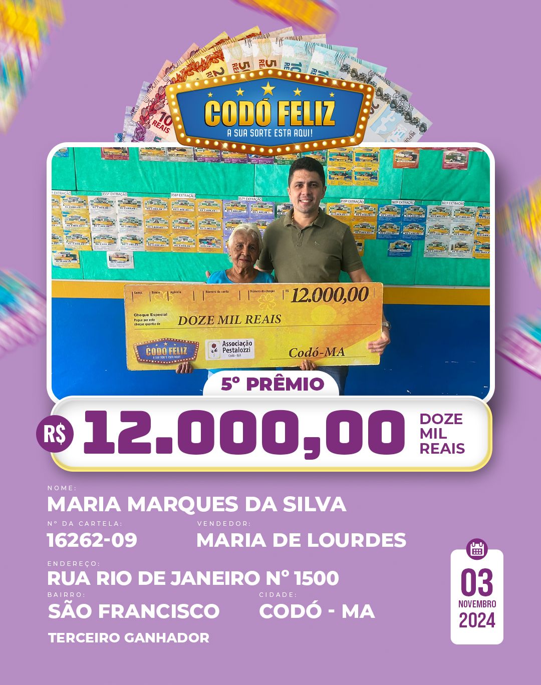 Veja quem foram os Ganhadores da 365° Extração do Codó Feliz Publicado em: 5 de novembro de 2024Autor: Alberto BarrosDeixe um Comentário!