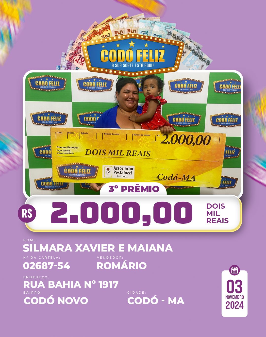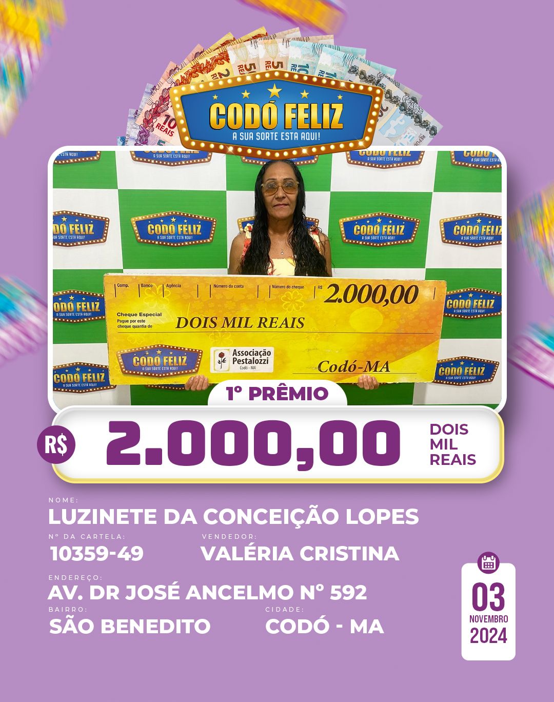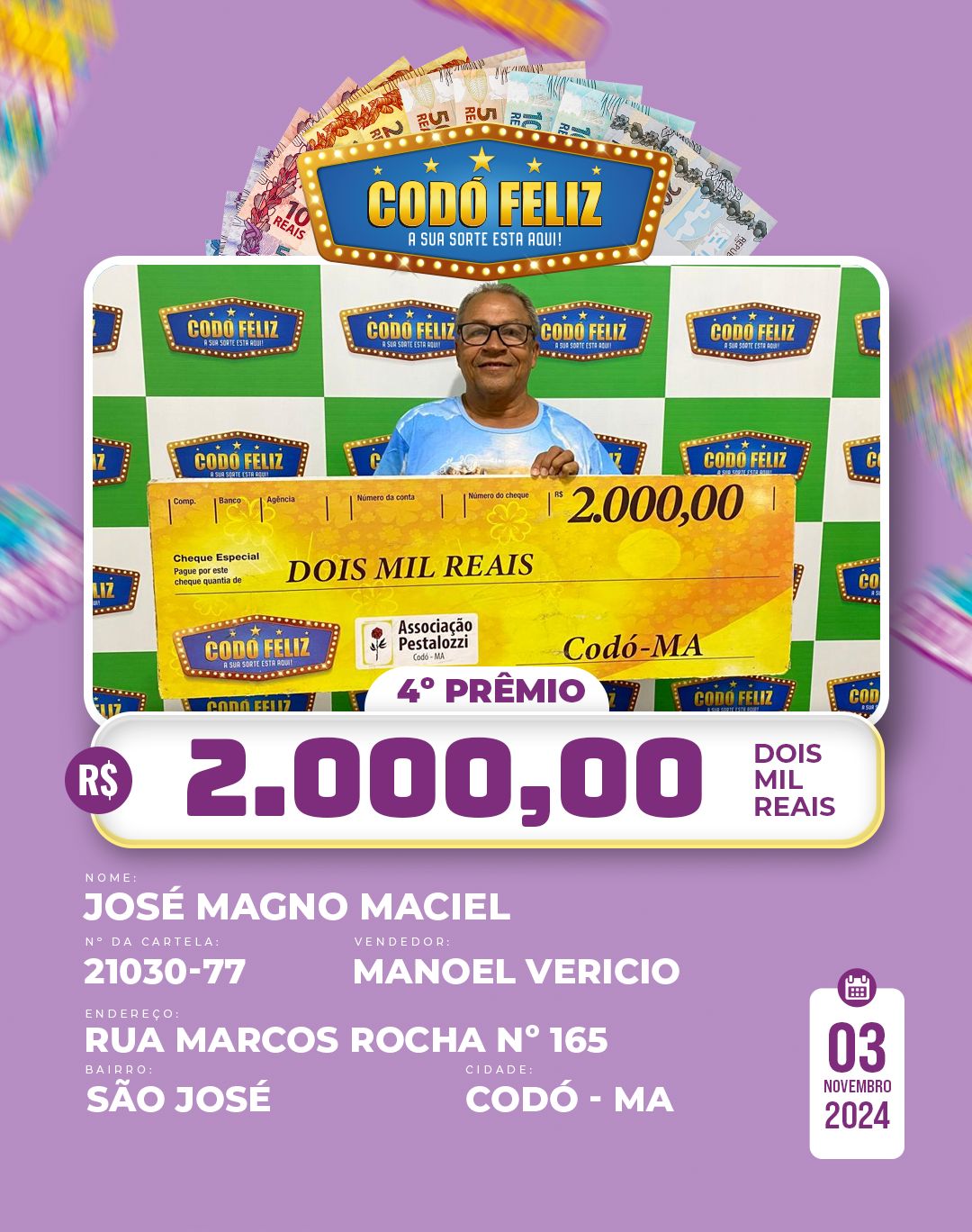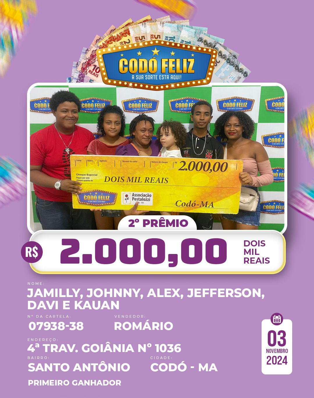 Veja quem foram os Ganhadores da 365° Extração do Codó Feliz Publicado em: 5 de novembro de 2024Autor: Alberto BarrosDeixe um Comentário!
