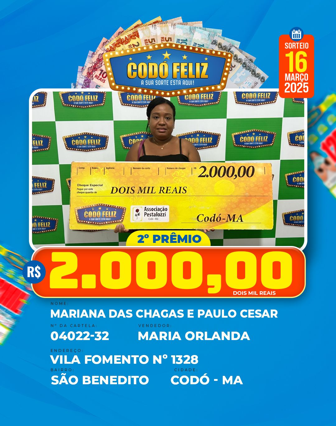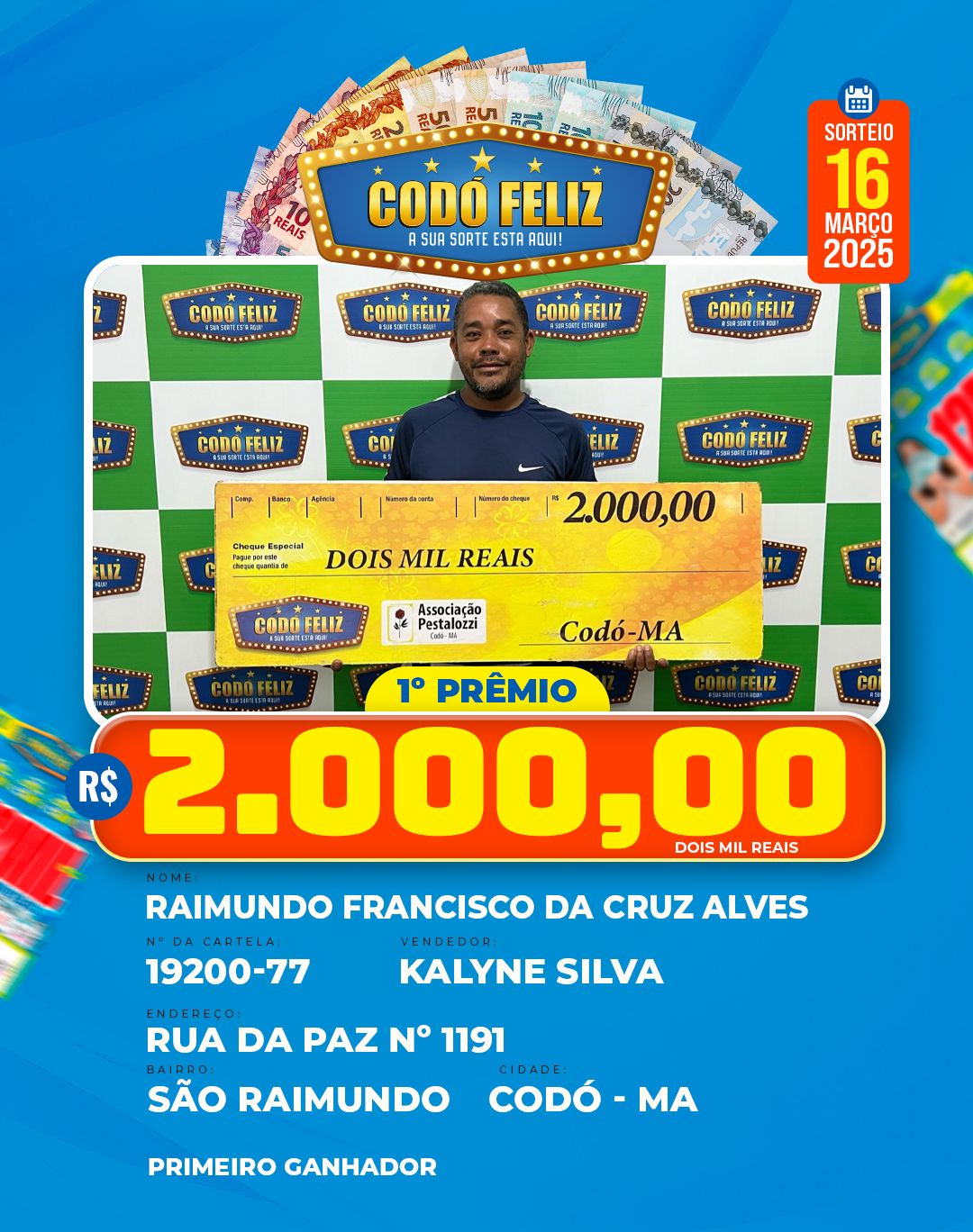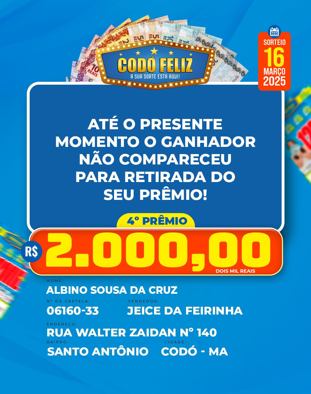 Veja quem foram os Ganhadores da 383° Extração do Codó Feliz Publicado em: 18 de março de 2025Autor: Alberto BarrosDeixe um Comentário!