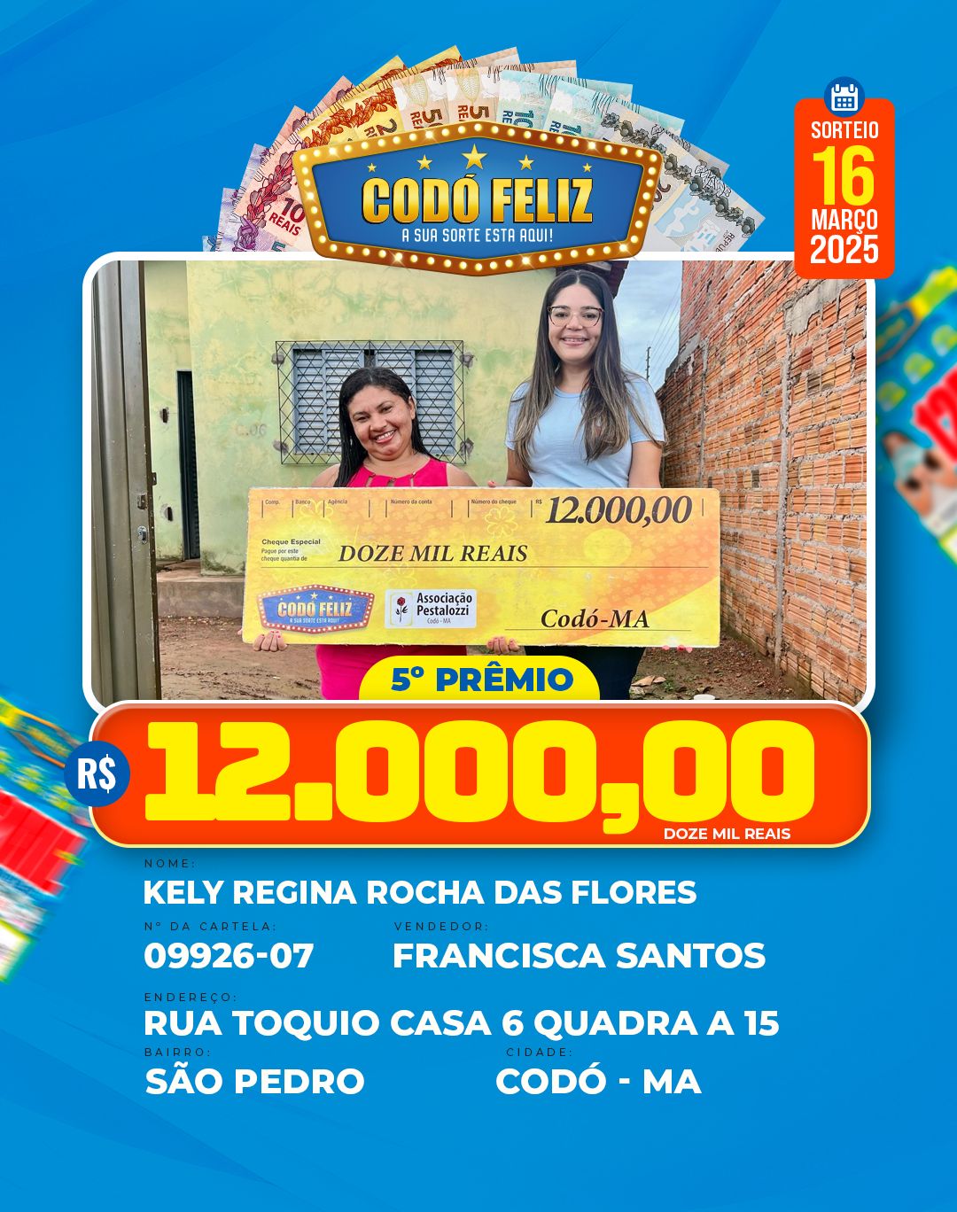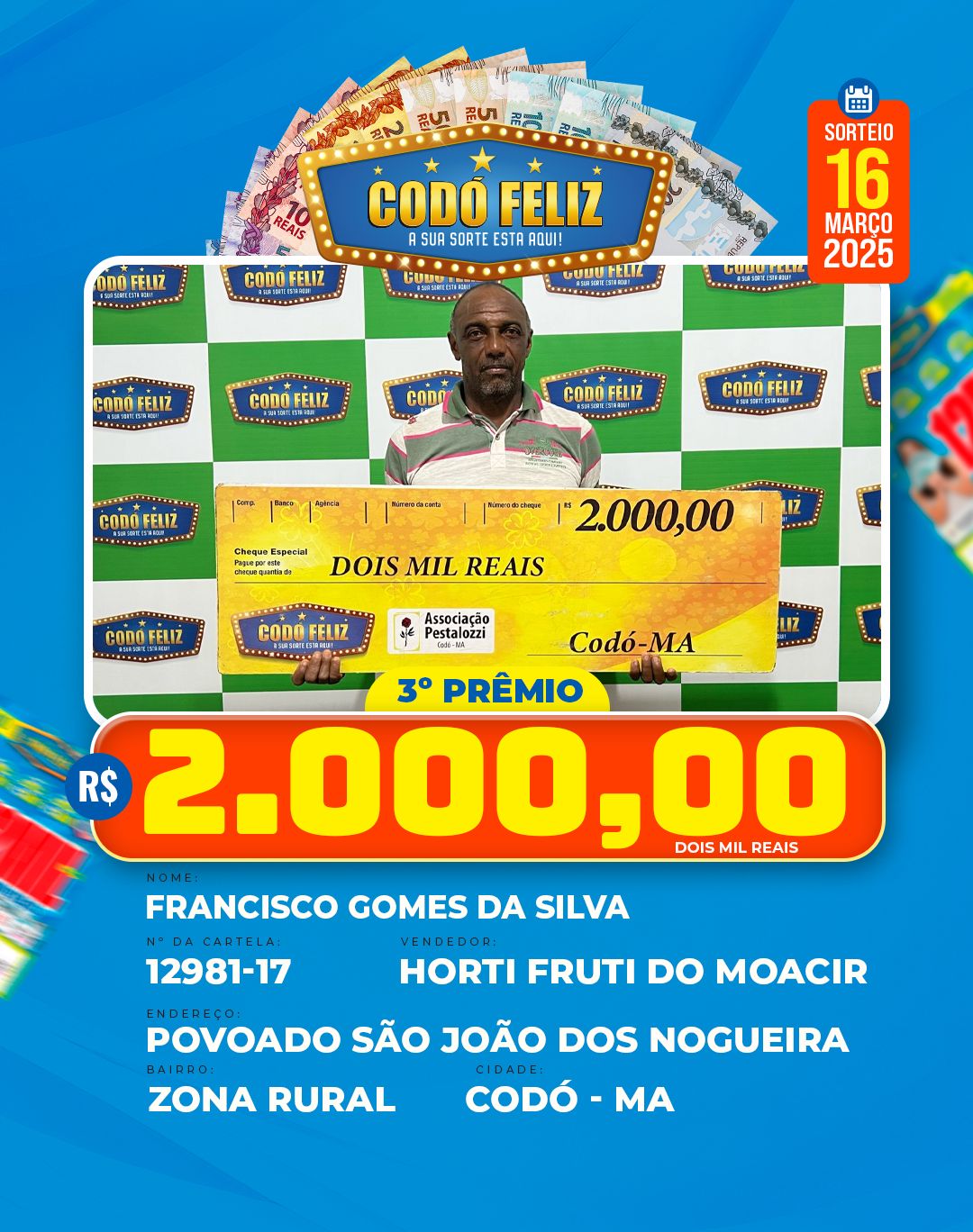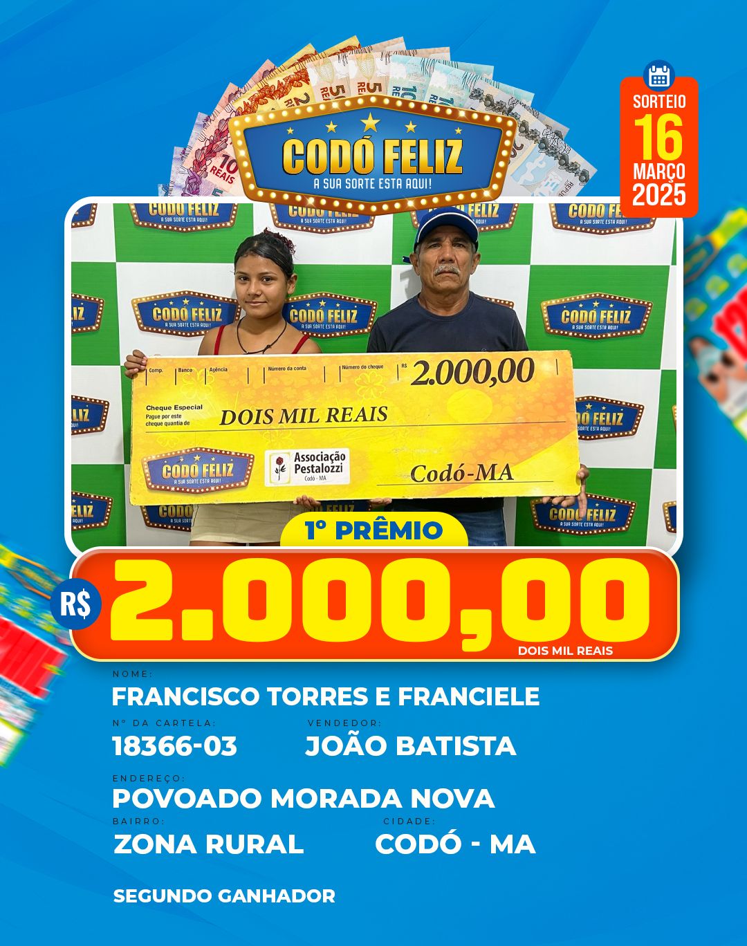 Veja quem foram os Ganhadores da 383° Extração do Codó Feliz Publicado em: 18 de março de 2025Autor: Alberto BarrosDeixe um Comentário!