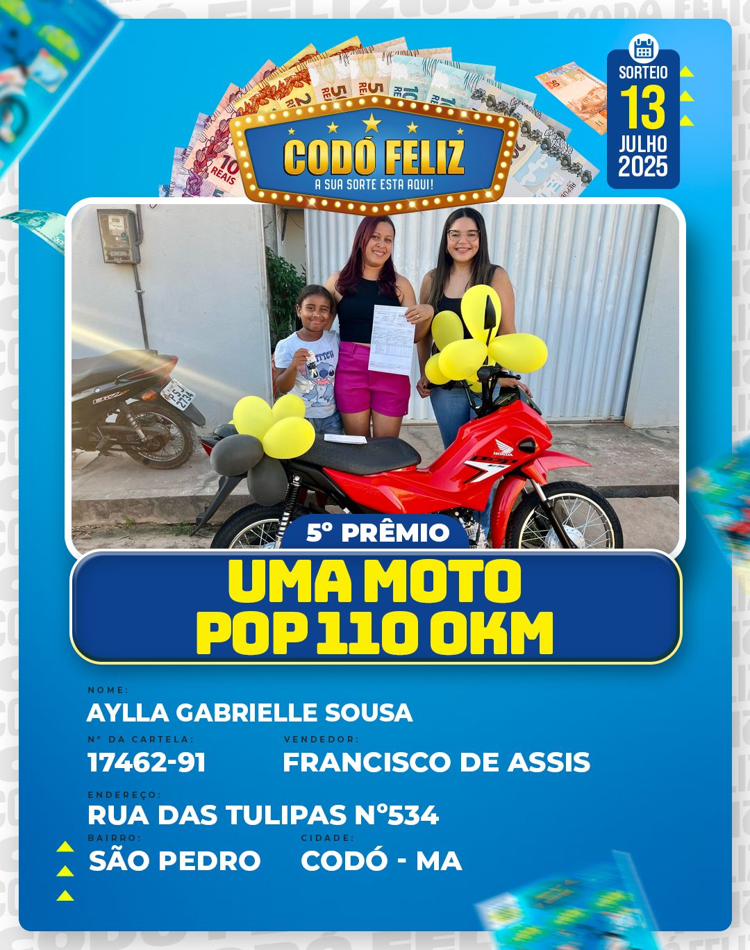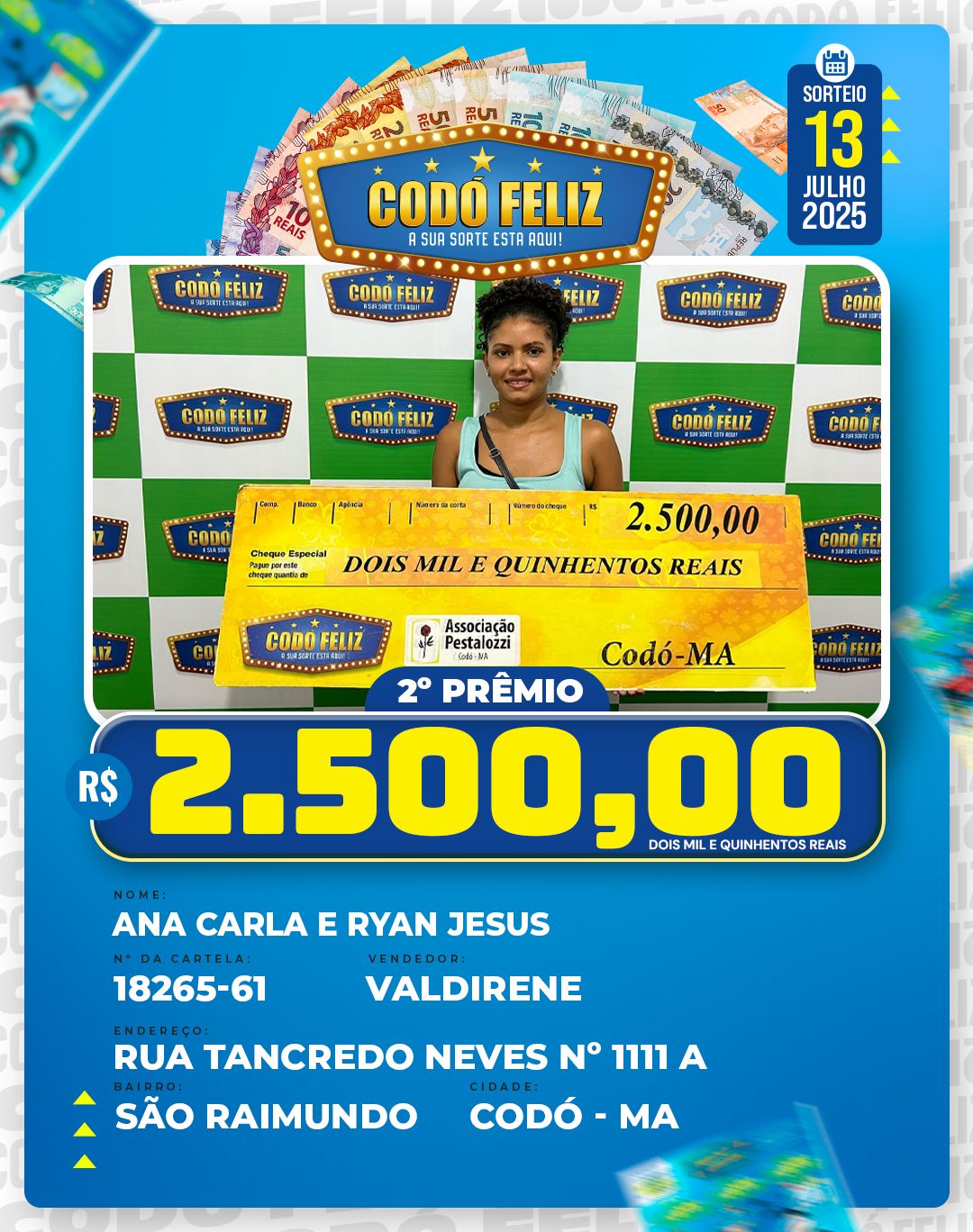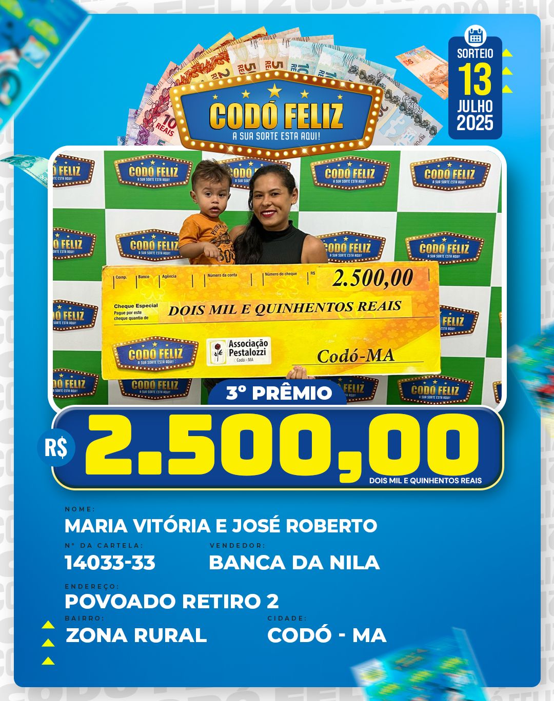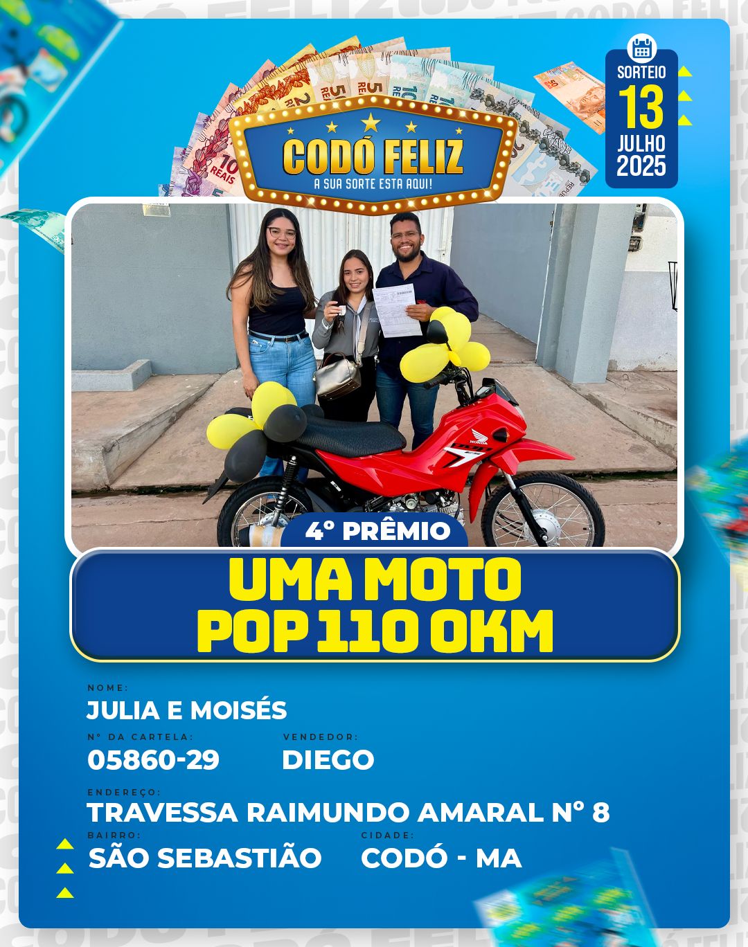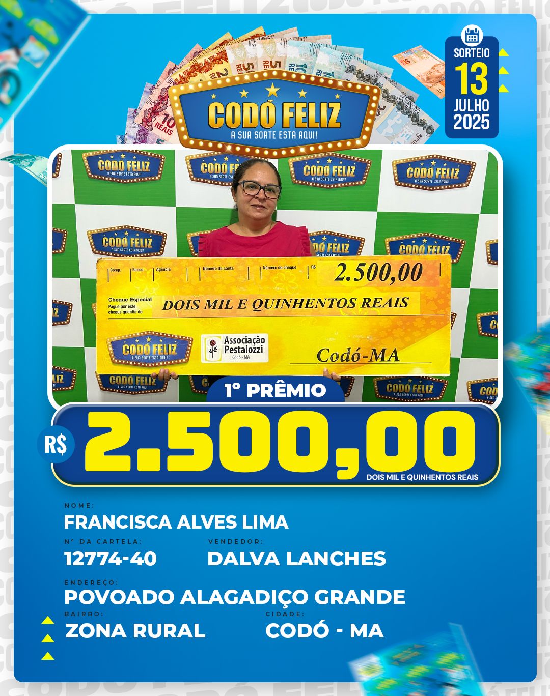 Veja quem foram os Ganhadores da 399° Extração do Codó Feliz Publicado em: 15 de julho de 2025Autor: Alberto BarrosDeixe um Comentário!